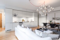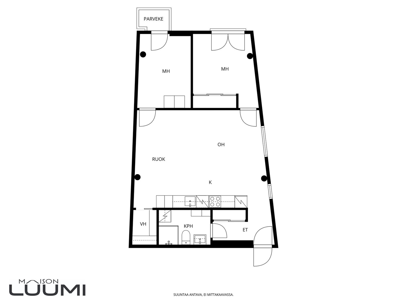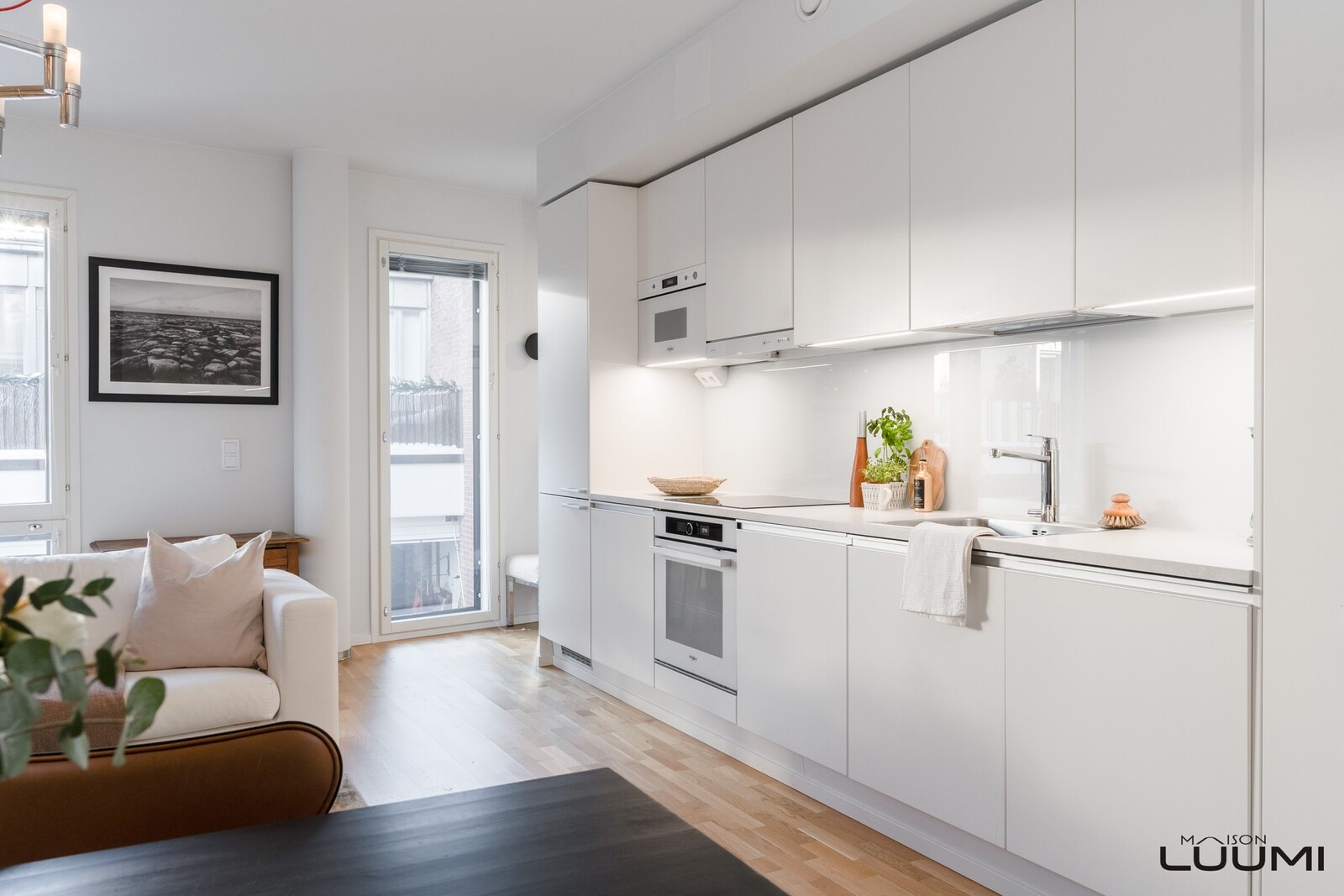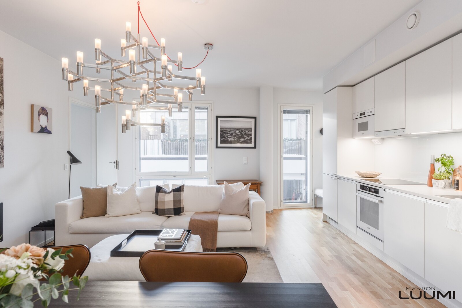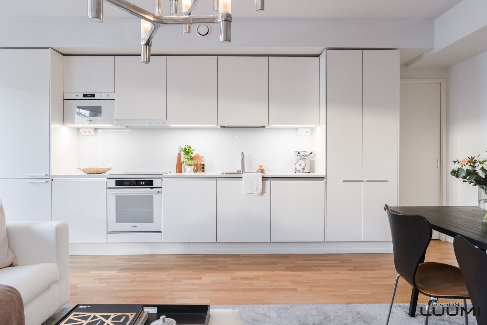 Kulmahuoneiston pohjaratkaisu on moderni, ja valo kulkee hienosti läpi koko toimivan kolmion. Vaaleassa avokeittiössä on kaikki herkut aamiaiskaappia myöden. Ruokatila on yhtenäistä tilaa keittiön ja avaran olohuoneen kanssa mahdollistaen asuinneliöiden täyden hyödyn.