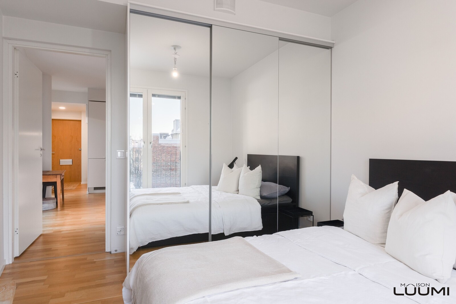 Päämakuuhuoneessa on hyvät säilytystilat ja suloinen ranskalaisparveke. Pienempi parvekkeellinen makuuhuone on ihanteellinen vieras/työhuone. Viidennen kerroksen sisäpiha takaa rauhalliset yöunet vaikka ikkunat auki. Selkeälinjainen kylpyhuone viimeistelee kokonaisuuden; tänne voit muuttaa suoraan sisään ja nauttia asumisesta ilman huolia yhtiön suurista remonteista.