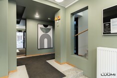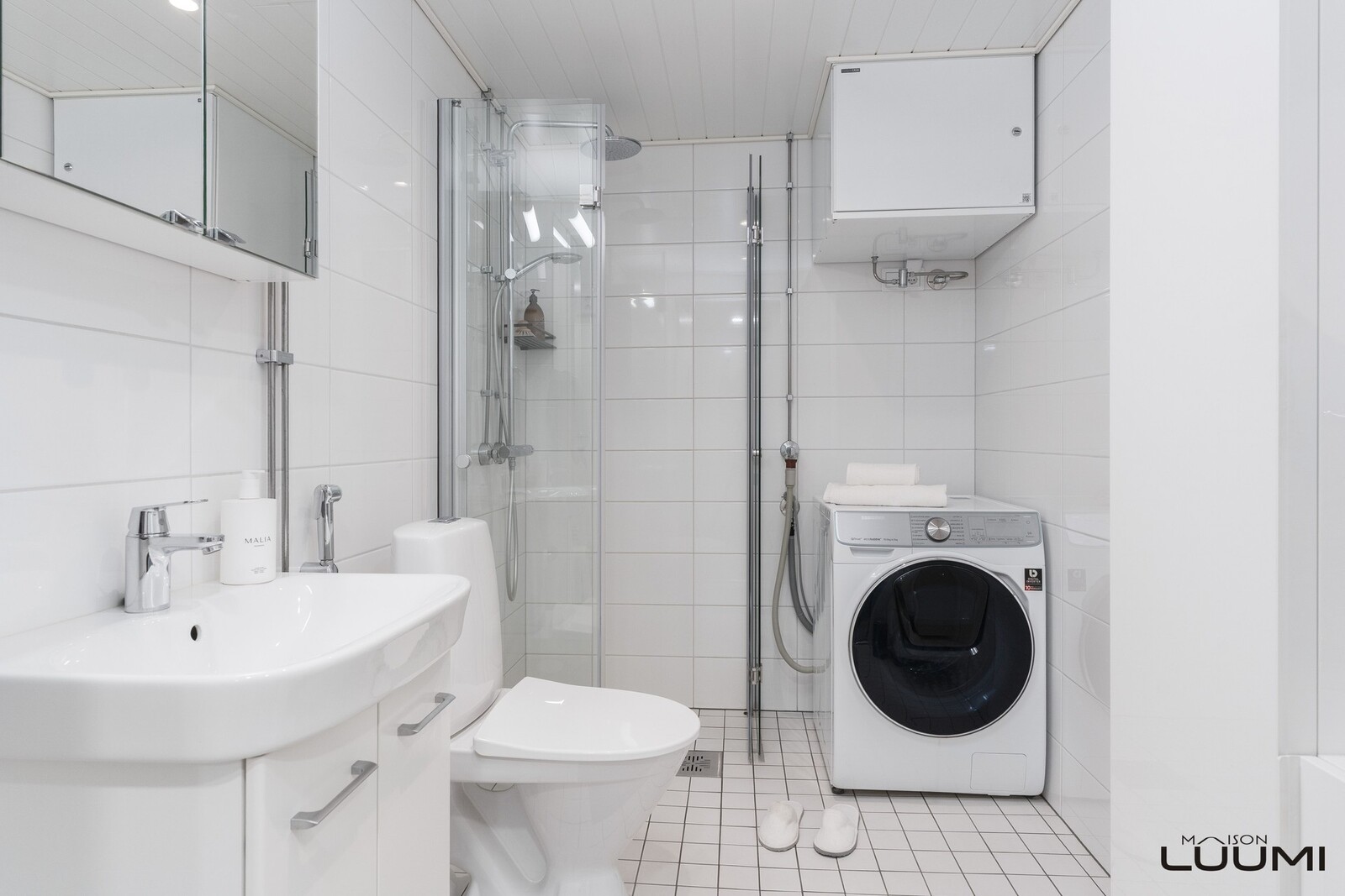 | Kuvaus: | Kylpyhuoneessa sadesuihku, kääntyvät suihkuseinät, wc-istuin, bideesuihku, käsienpesuallas, allas- ja peilikaappi, pesukoneliitäntä (torni mahtuu) sekä huoneistokohtainen ilmanvaihtokone. |