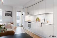 | Kuvaus: | Avokeittiö on varusteltu integroidulla jää-/pakastinkaapilla ja astianpesukoneella. Keittiöstä löytyy lisäksi induktioliesi, erillisuuni, liesituuletin sekä mikroaaltouuni. Työtasot ovat laminaattia. |
