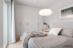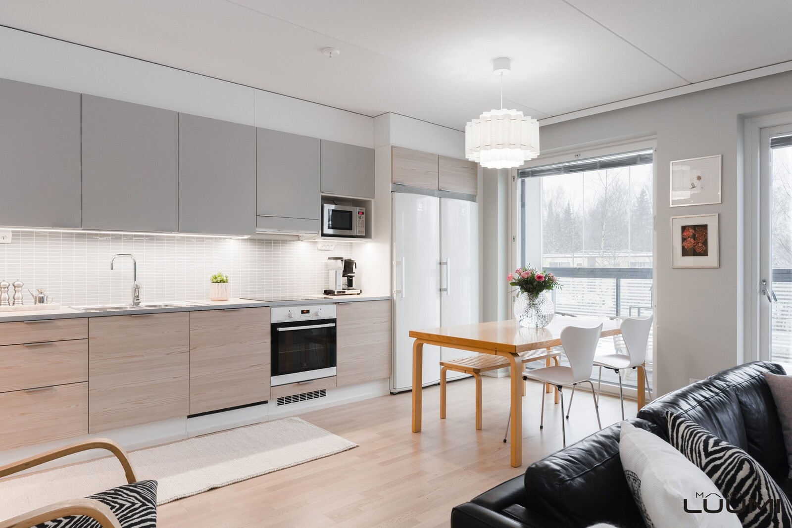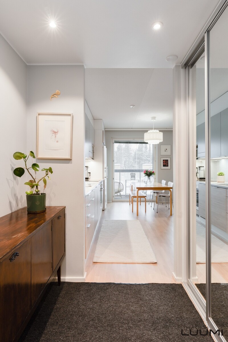 Moderni pohjaratkaisu mahdollistaa kolmen makuuhuoneen ja kahden wc:n kokonaisuuden ilman hukkaneliöitä. Vaalea avokeittiö on yhtenäistä tilaa olohuoneen kanssa, ja ruokapöydälle on paraatipaikka huoneiston keskiössä.