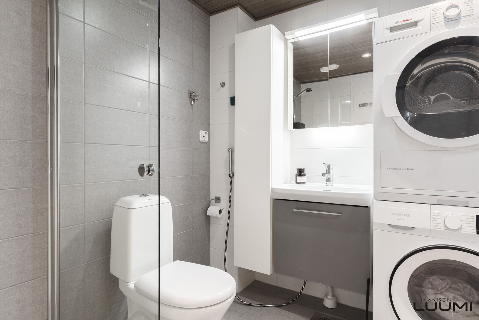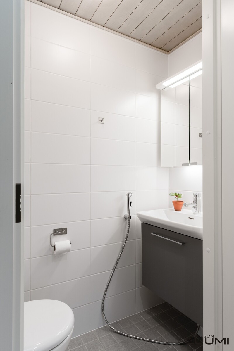 | Kuvaus: | Erillisessä WC:sä wc-istuimen lisäksi bideesuihku, käsienpesuallas sekä allas- ja peilikaappi. |
