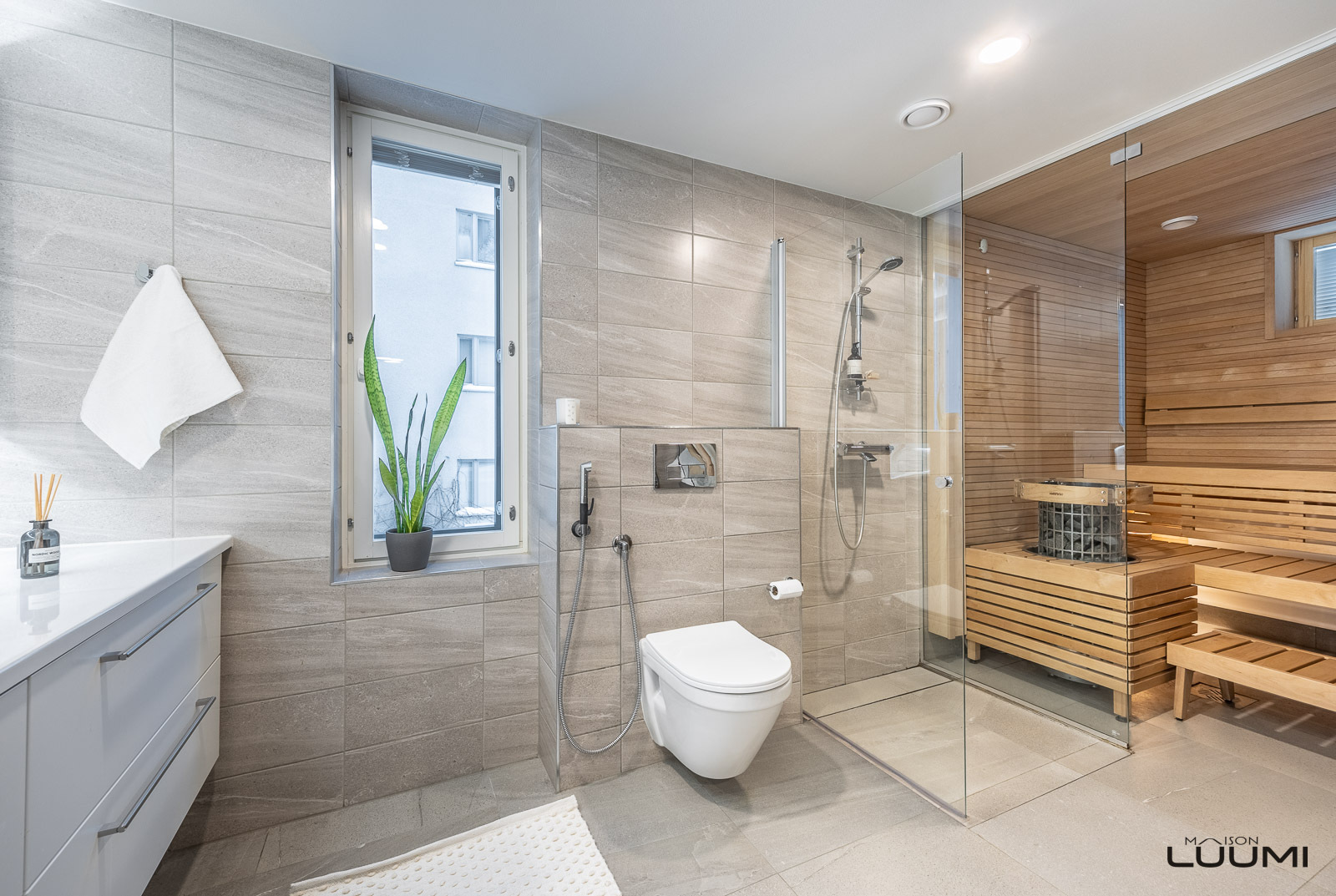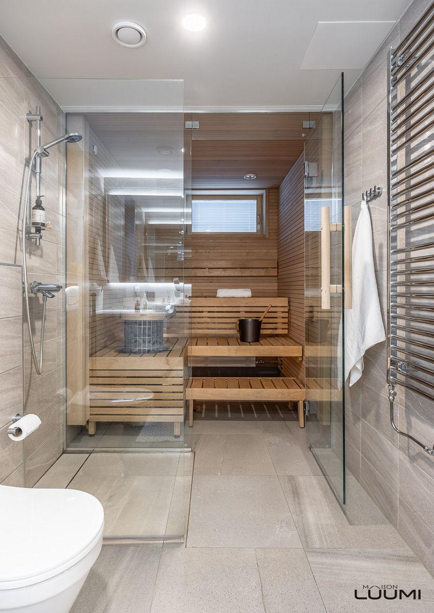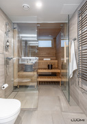 | Kuvaus: | Ikkunallinen sauna, joka on erotettu lasiseinällä kylpyhuoneesta. Tornikiuas. |