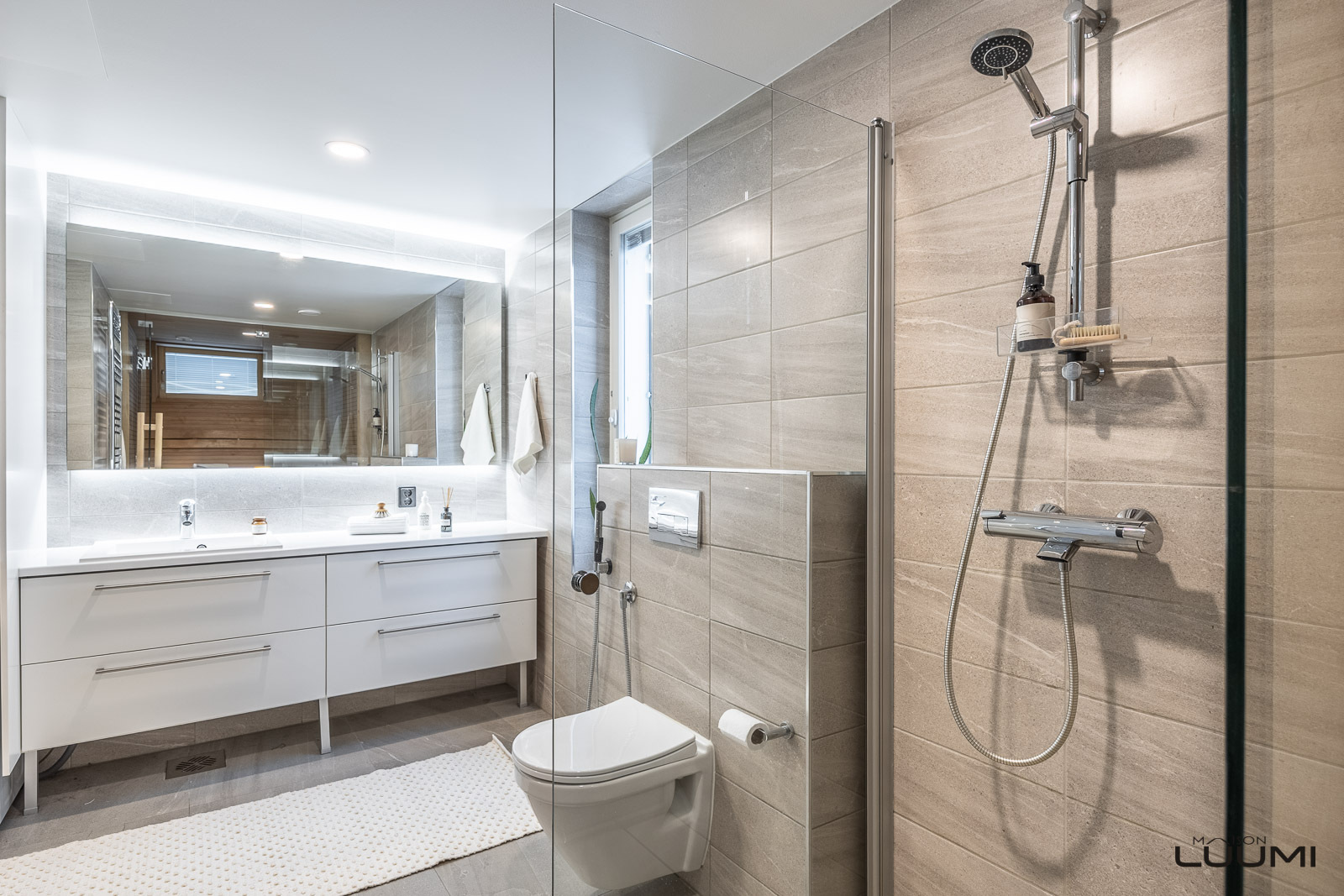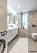 | Kuvaus: | Valoisa ja saunallinen kylpyhuonekokonaisuus. Varusteina: suihku, lasinen suihkuseinä, seinä-WC, käsisuihku, allaskaapit, pesuallas, peili, kylpyhuonekaapisto, pyyhekuivain, pesukoneliitäntä. |