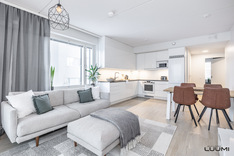 | Kuvaus: | Avaraa ja yhtenäistä tilaa avokeittiön kanssa. Käynti lasitetulle länsiparvekkeelle. |