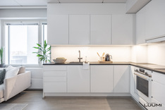 | Kuvaus: | Selkeälinjainen valkoinen avokeittiö. Varusteina: jääkaappi/pakastin, keraaminen liesi, liesituuletin (suodatin), erillisuuni, integroitu astianpesukone ja kalustemikro, laminaattityötasot. Hyvin tilaa ruokapöydälle. |