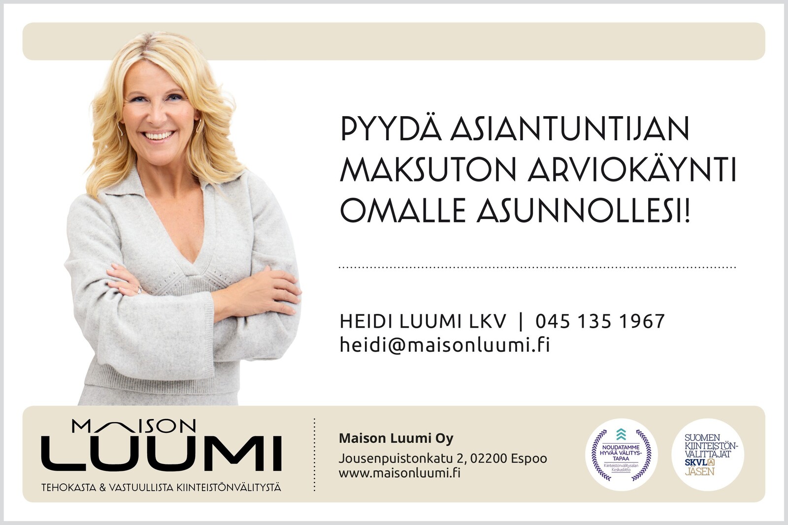 Myyntiä hoitaa HEIDI LUUMI LKV 045-135 1967, heidi@maisonluumi.fi