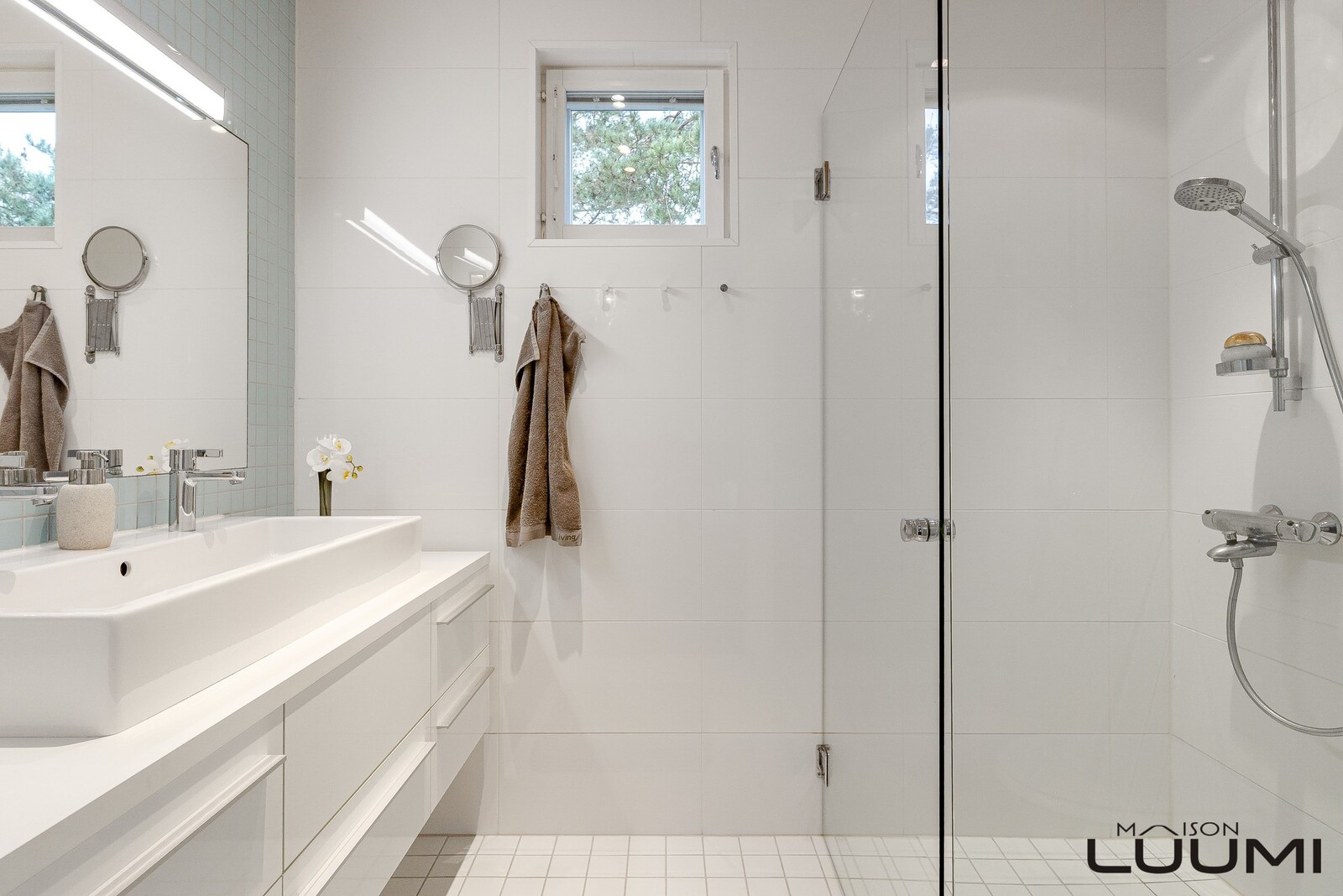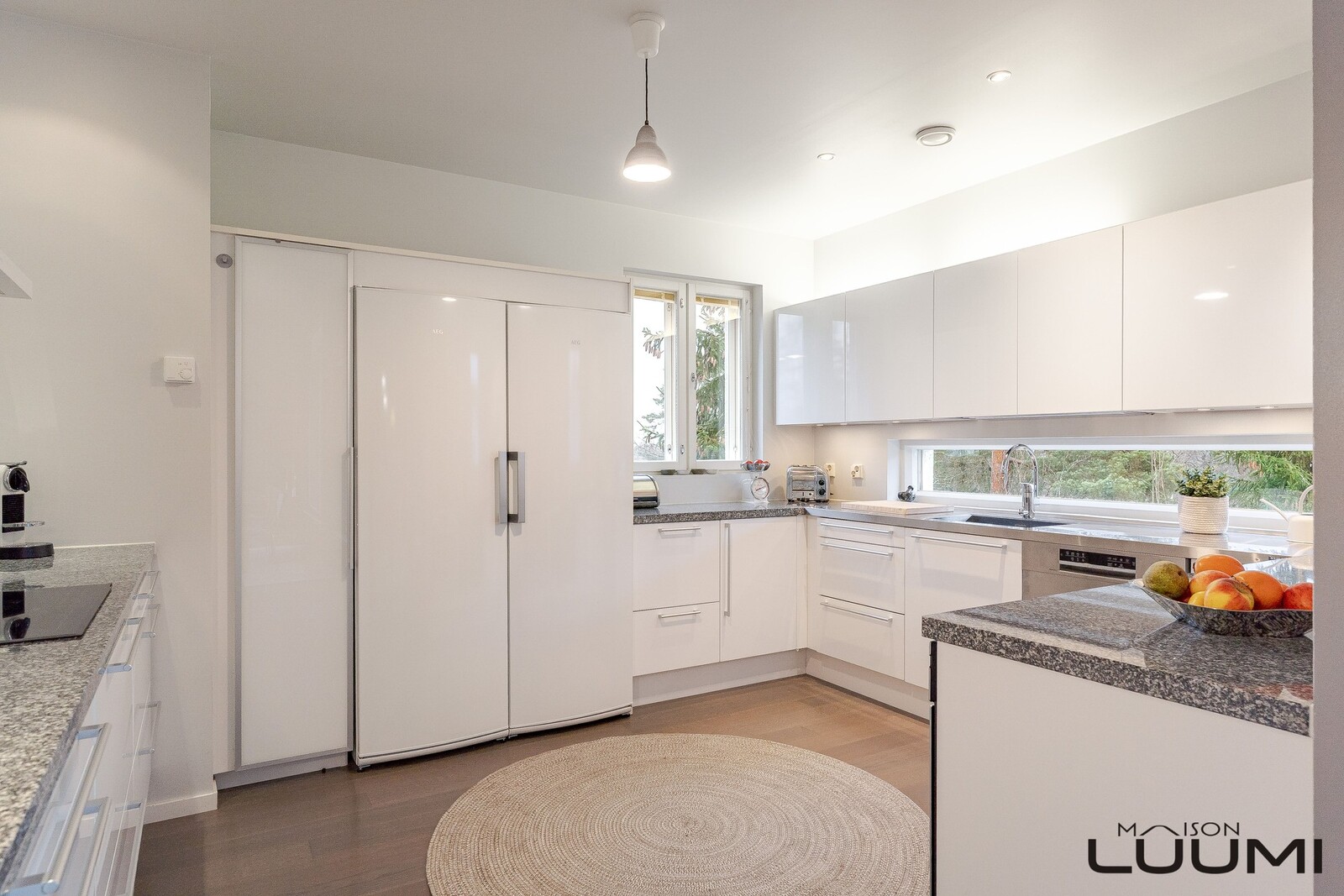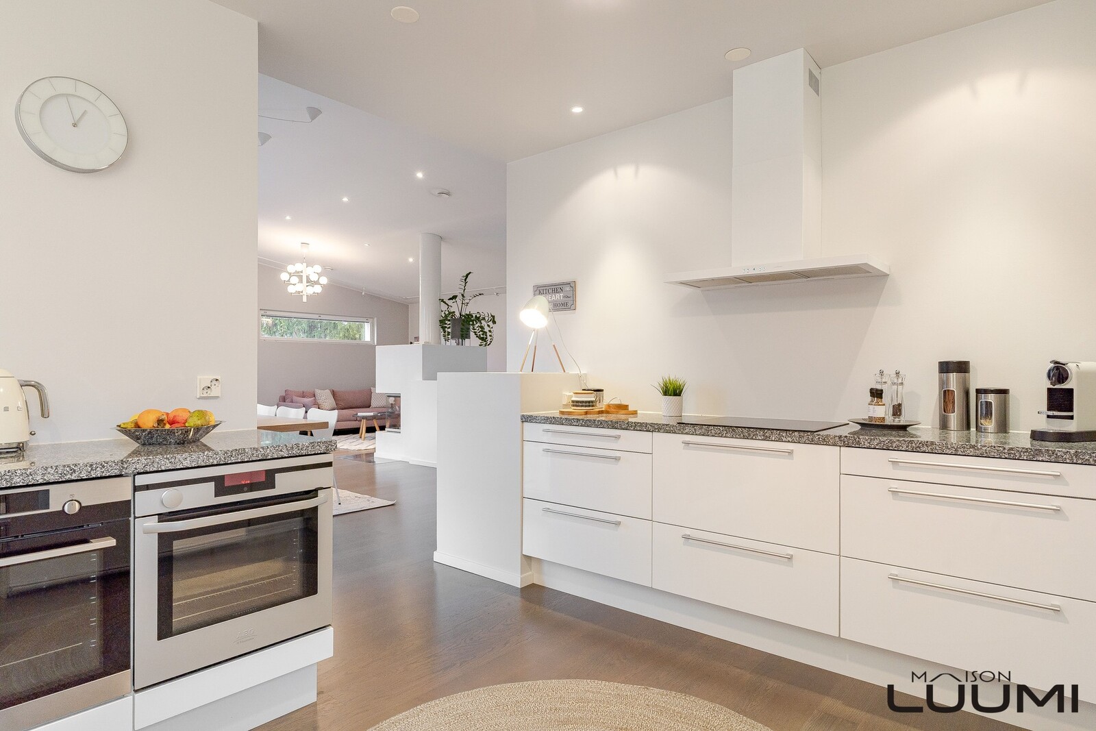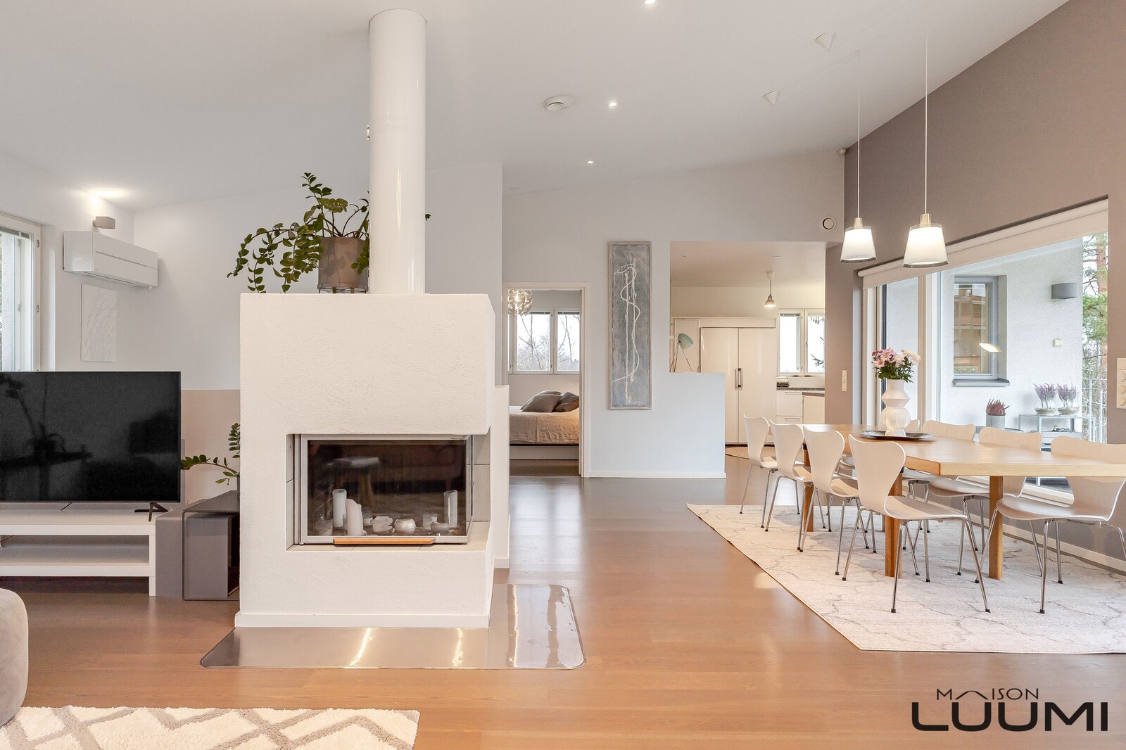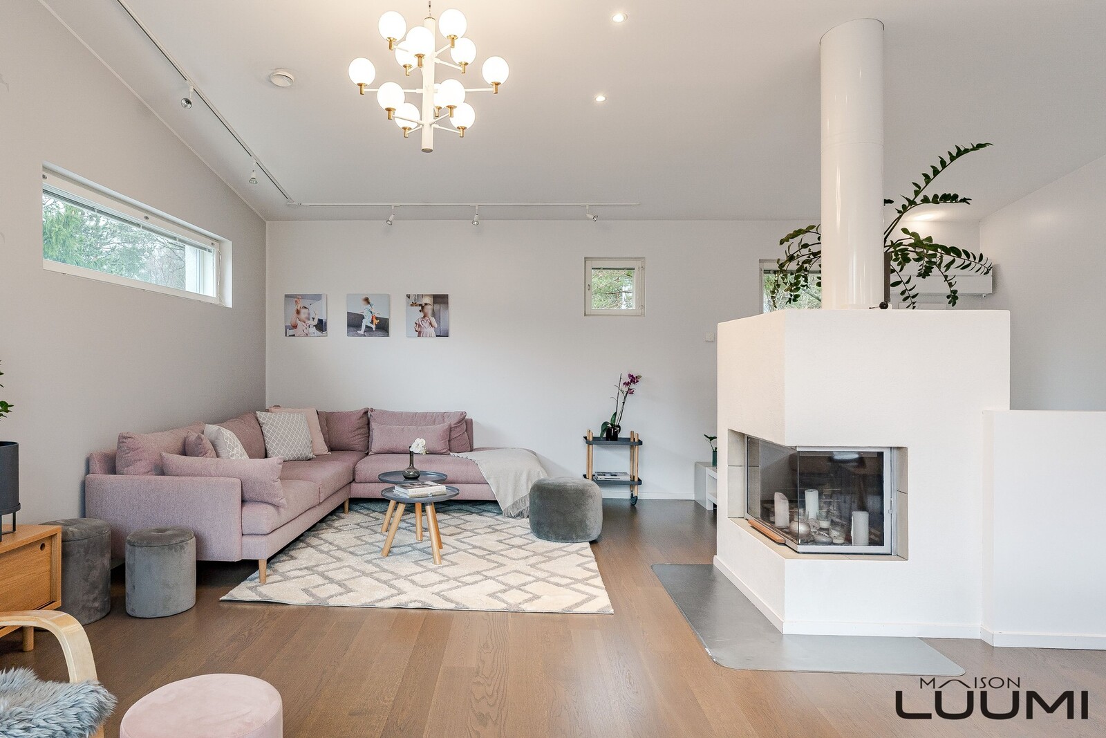 Näyttävä kivitalo on tasokasta asumista parhaimmillaan. Koko perheen ehdoton suosikkipaikka on yläkerran valoisa ja korkea olohuone, johon luonnonvalo tulvii sisään isoista ikkunoista. Modernissa Puustelli -keittiössä kahvikin maistuu paremmalta, kun aamuaurinko pääsee anteliaasti sisään. Iso keittiö on varustettu runsailla kivitasoilla ja säilytystiloilla, ja se täydentää hienosti talon toiminnallisuutta. Tilava ruokatila on paraatipaikalla keittiön ja olohuoneen välittömässä yhteydessä. Upea takka luo tunnelmaa koko kerrokseen.