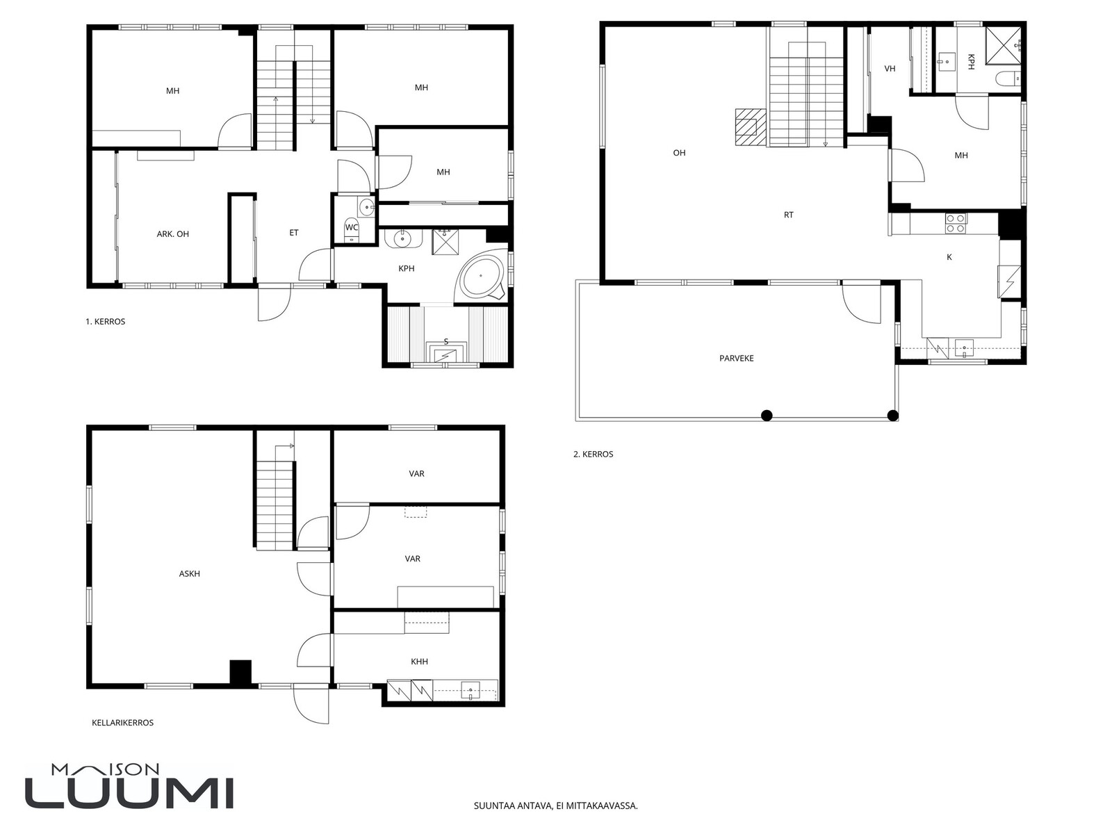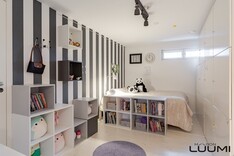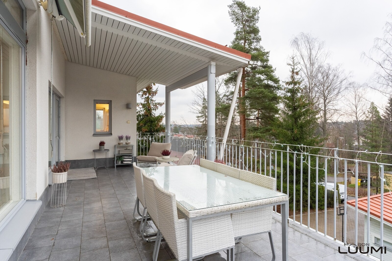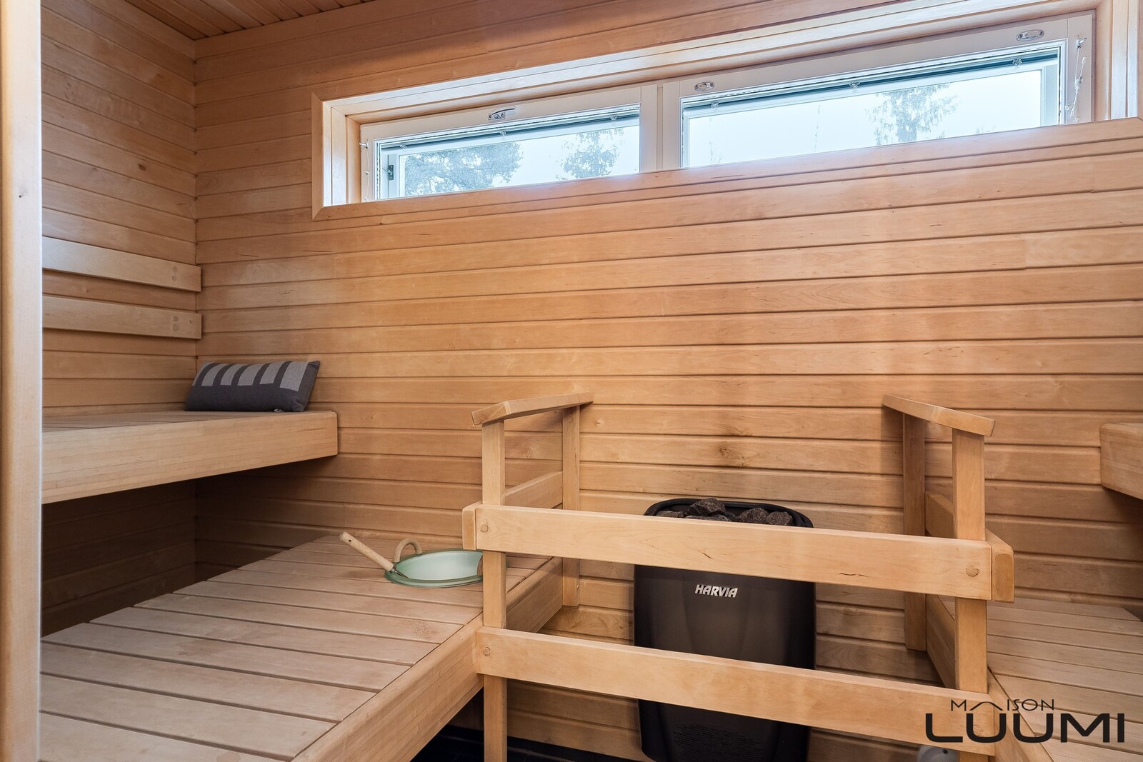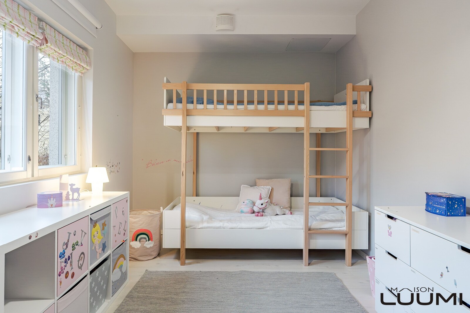 Pohjaratkaisu on muunneltavissa, kun kolmessa kerroksessa on yhteensä peräti 270 m2. Alkuperäisenä ajatuksena yläkerta oli suunniteltu ”aikuisille”, keskikerros nuorisolle ja alakerta kaikkien yhteiseksi bonustilaksi. Makuuhuonekäyttöön ja oleskeluun sopivia huoneita on kuitenkin jokaisessa kerroksessa, mikä mahdollistaa monta eri käyttötapaa. Runsaat säilytystilat ja erillinen kodinhoitohuone (ja pyykkikuilu!) ovat ison perheen pelastus. Talotekniikka on nykyaikaista, sen takaa valokuitukaapelointi ja vesikiertoinen lattialämmitys.