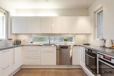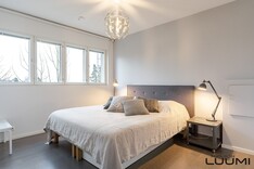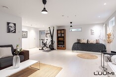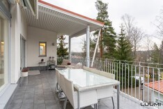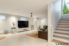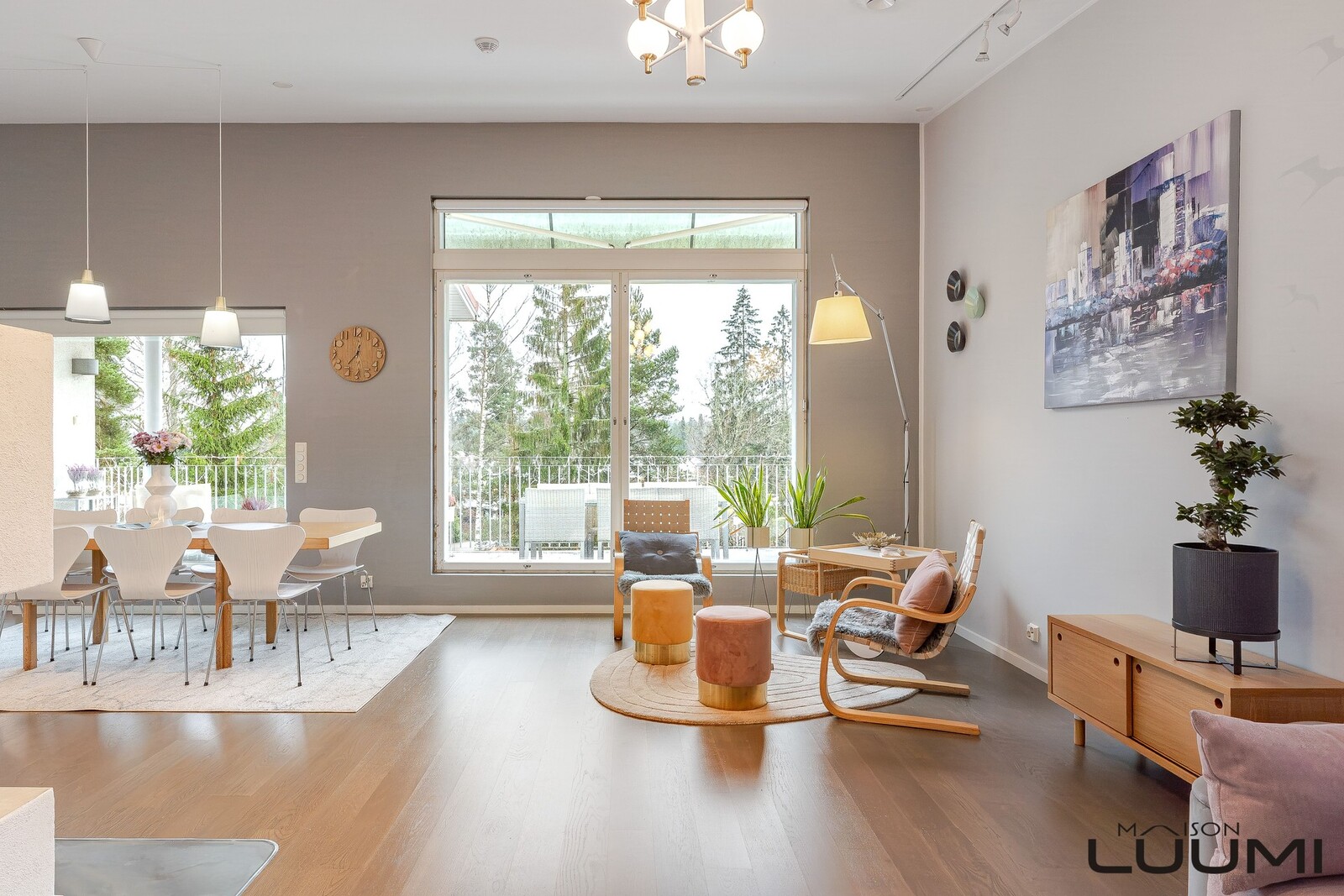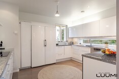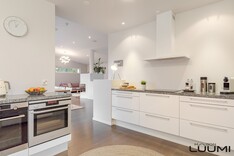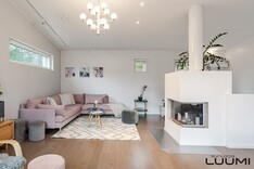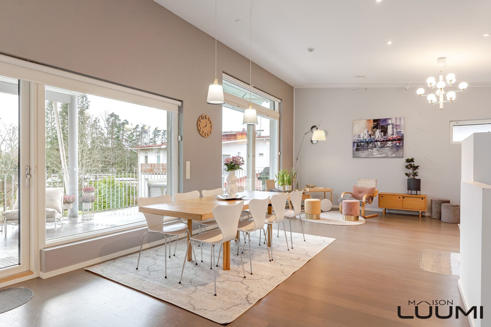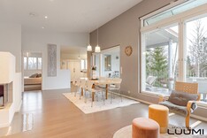 | Kuvaus: | Olohuone jatkuu avoimena tilana ruokailutilaan ja keittiöön. Korkea huonekorkeus sekä laajat ikkunapinnat luovat erityisen avaran vaikutelman. Käynti isolle aurinkoterassille. |