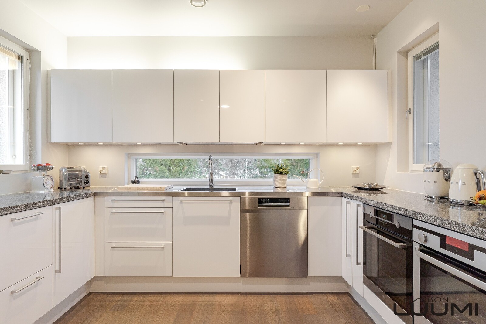 | Kuvaus: | Puustelli -keittiön varusteena täysimittaiset jää- ja pakastinkaapit, induktioliesi, erillisuuni, höyryuuni, liesituuletin ja astianpesukone. Kodinkoneet uusittu 2021, lukuunottamatta höyryuunia (alkuperäinen) ja astianpesukonetta (2017). Keittiön kaappien ovet vaihdettu 2017. Työtasot Ristijärven kiveä (2021). |