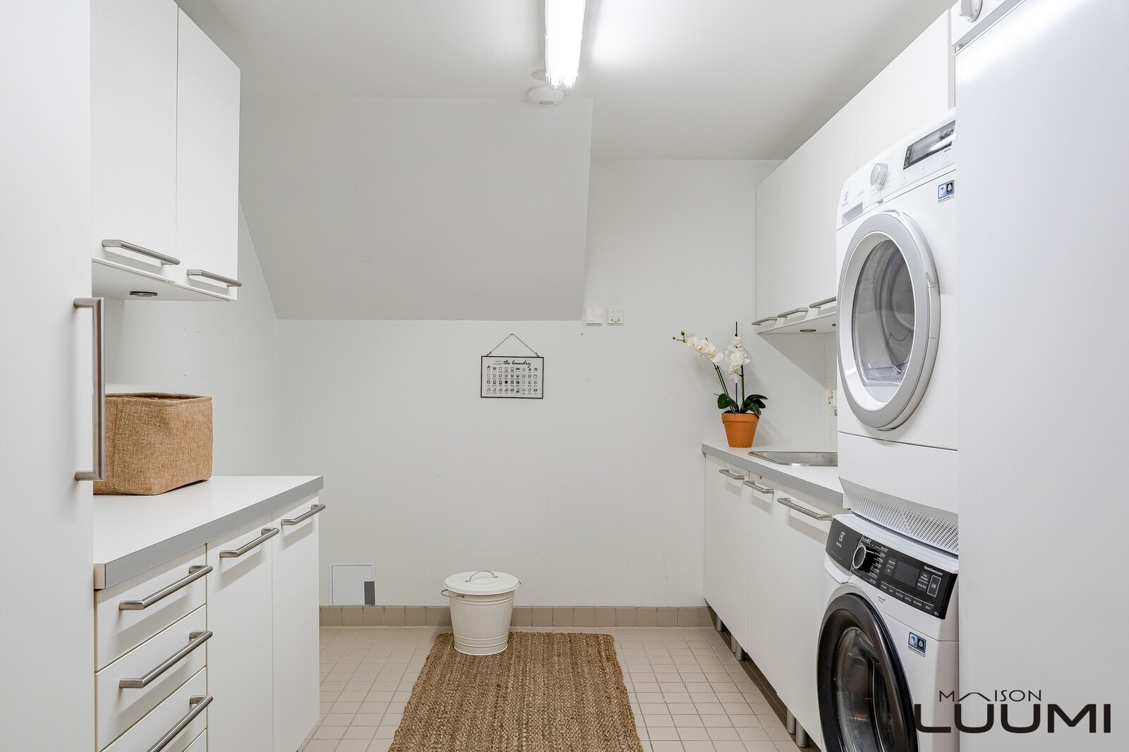 | Kuvaus: | Tilava kodinhoitohuone kellarikerroksessa. Varusteena käsienpesuallas, pesukoneliitäntä sekä hyvin säilytys- ja työskentelytilaa. |