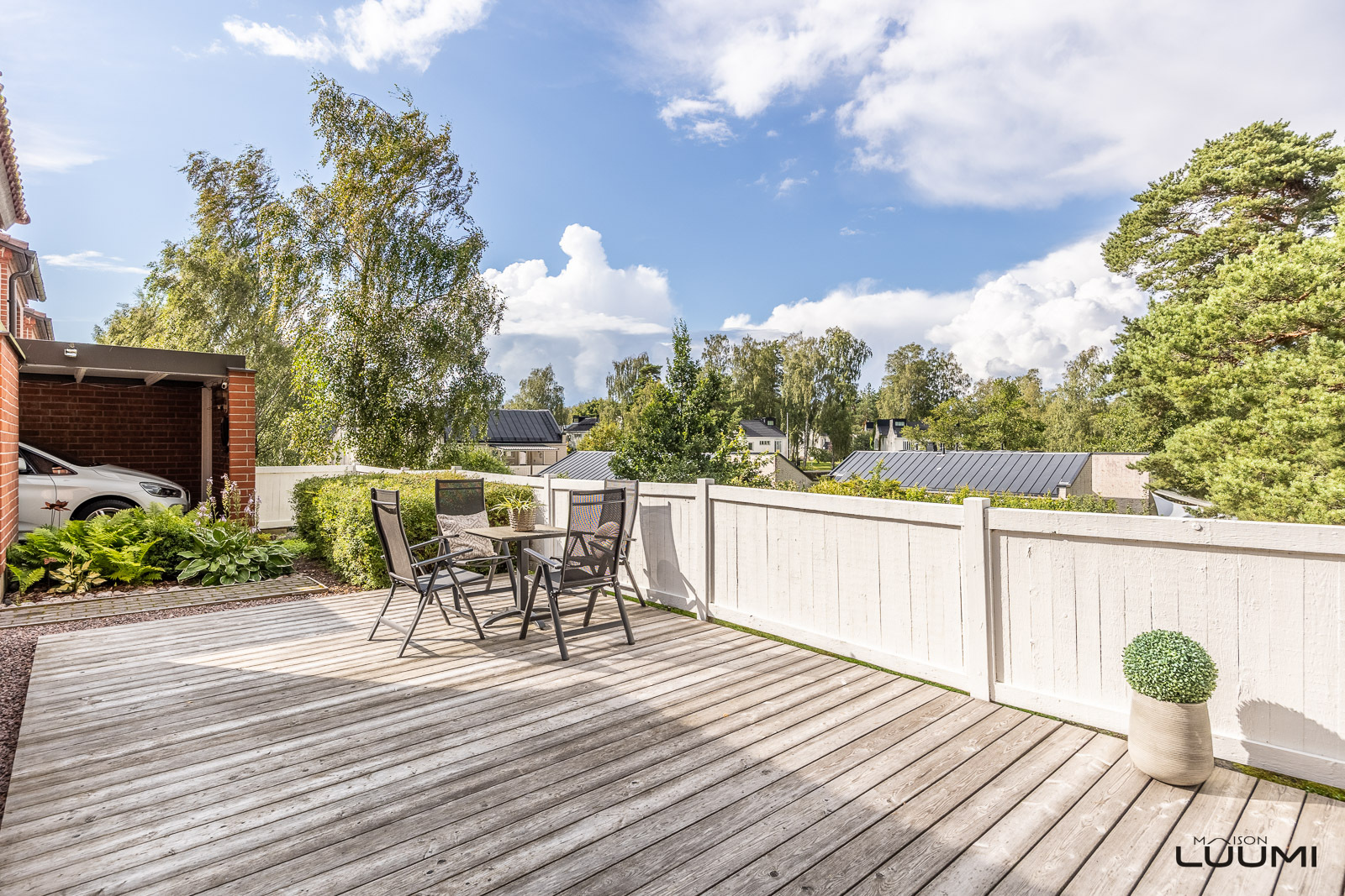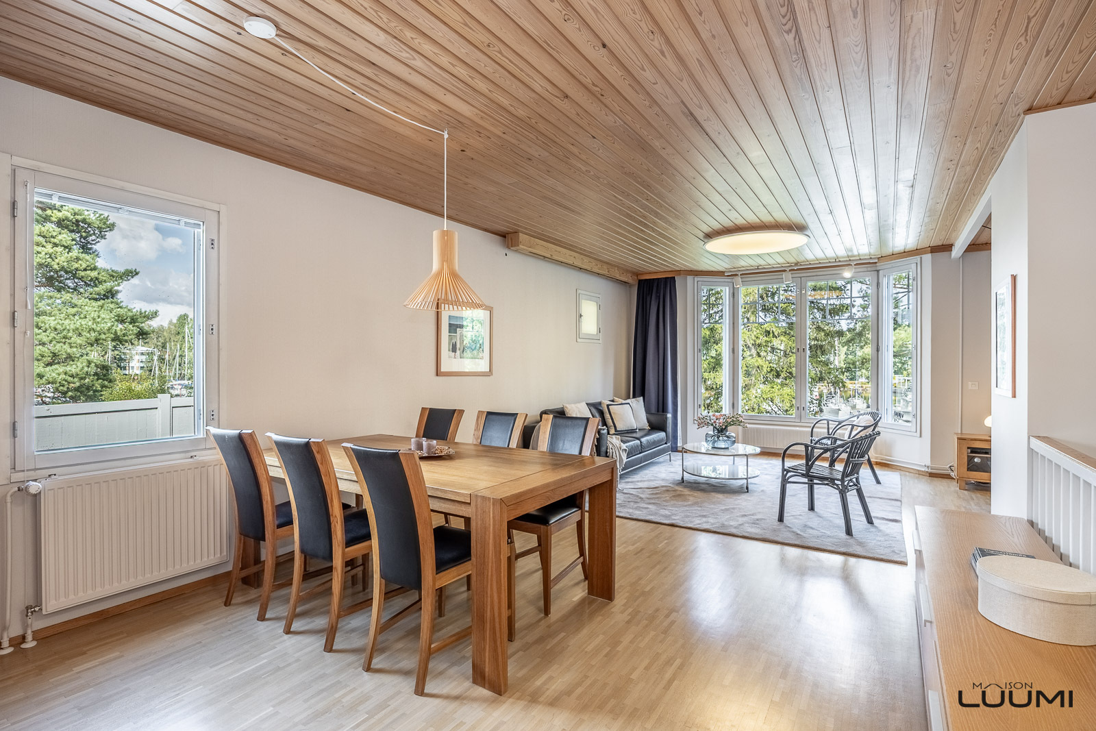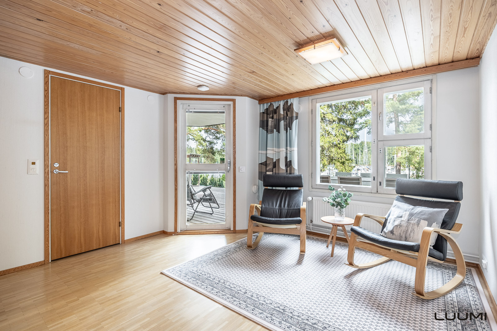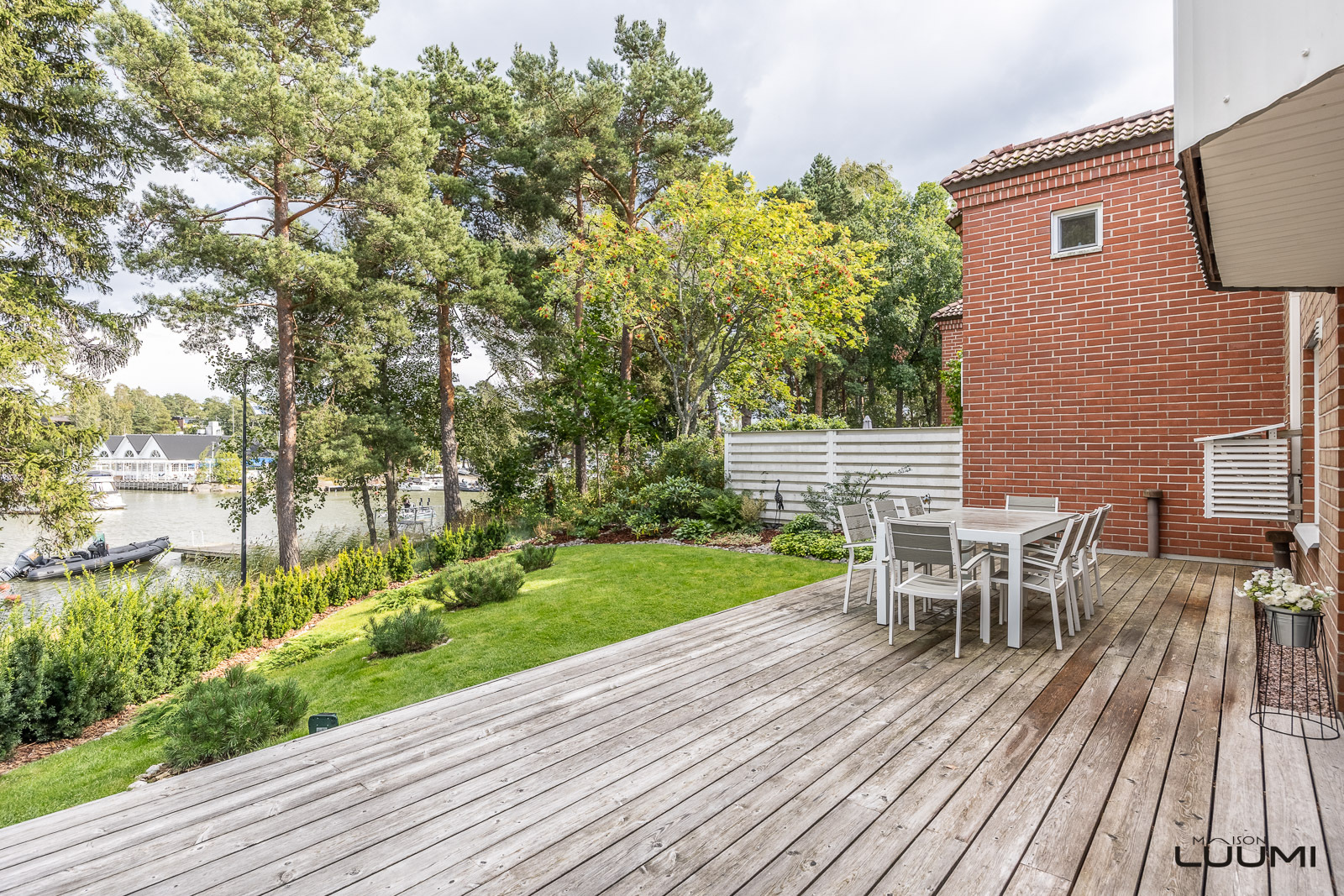 Kaunis punatiilitalo tuo mieleen englantilaisen maalaismaiseman ja se sopii merelliselle rinnetontille täydellisesti. Tasokas huoneistoremontti on tehty vuonna 2018; mm. upea KVIK-keittiö ja raikkaat kylpyhuoneet ovat täysin uudistettu ja varustettu vastaamaan nykypäivän toiveita. Kattava remontti ei rajoittunut sisätiloihin vaan samalla uudistettiin upea piha-alue katseenkestäväksi. Aurinkoisia terassialueita on nyt kahdessa tasossa, ja kauniit istutukset kehystävät nurmialuetta. Meri on läsnä jokaisessa päivässä ja oman veneen saa parkkiin yhtiön laituriin.