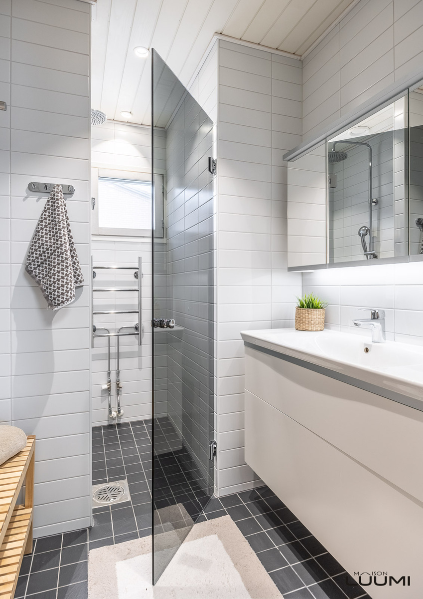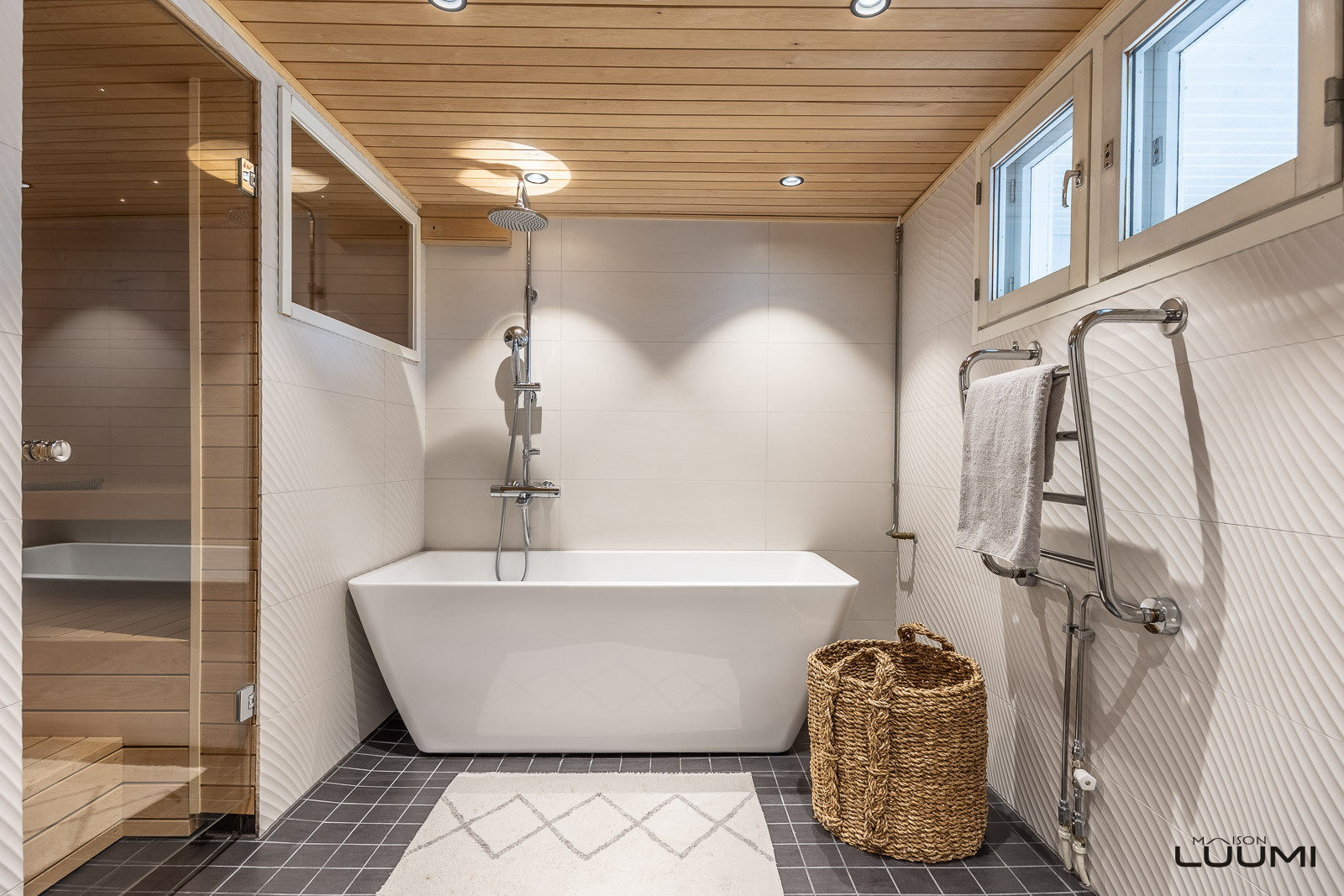 | Kuvaus: | Kylpyhuone kummassakin kerroksessa. Yläkerran kylpyhuoneessa sadesuihku, käsienpesuallas, peili- ja allaskaappi, ikkuna sekä kaksi pyyhekuivainta. Alakerran ikkunallinen kylpyhuone saunan yhteydessä, varusteena sadesuihku, pyyhekuivain ja amme. Kylpyhuoneet uusittu 2018 |