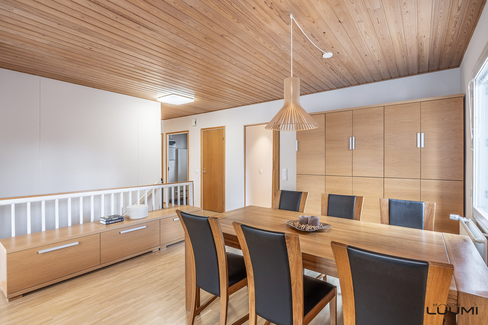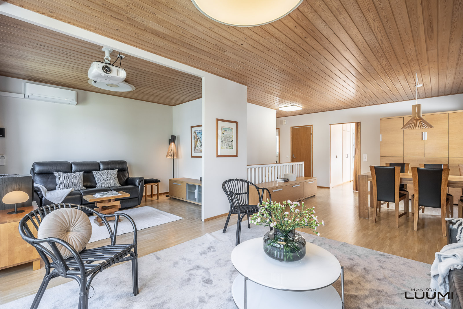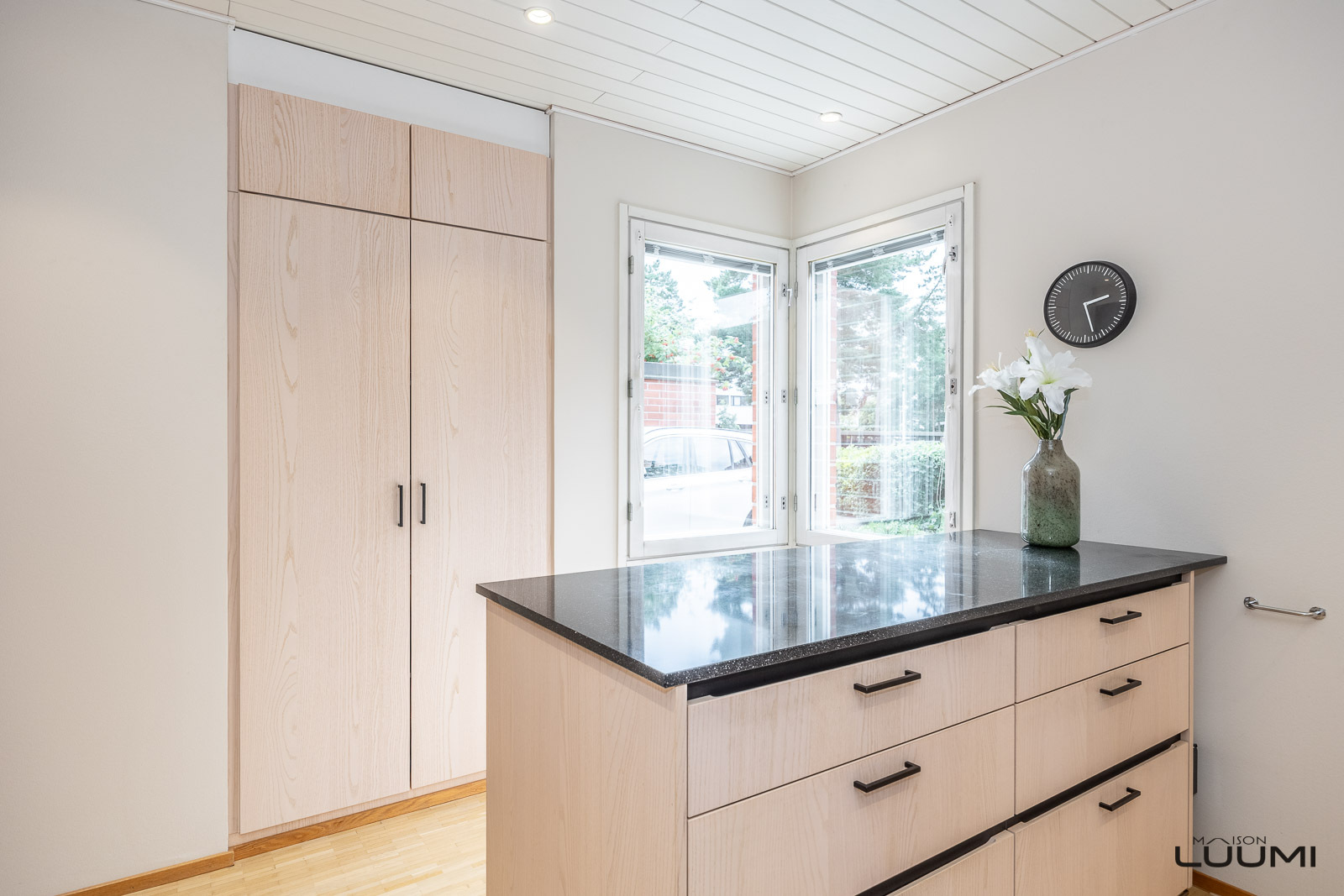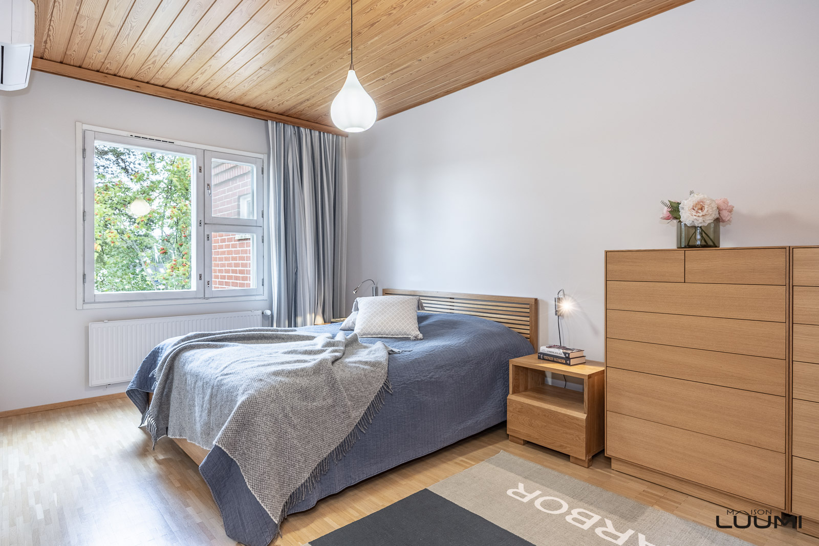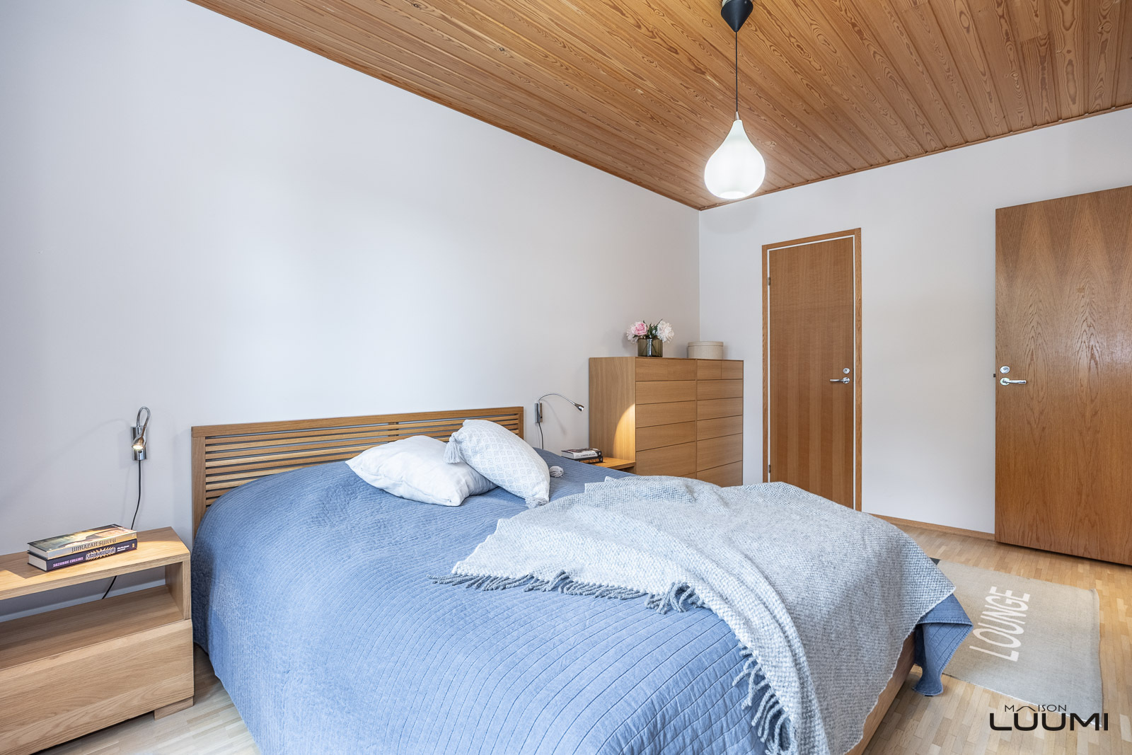 Makuuhuoneita on nykyisessä pohjaratkaisussa kaksi ja tarvittaessa jopa neljä. Kellarikerrokseen on toteutettu viihtyisä takkahuone ja ruhtinaallisen iso kodinhoitohuone, jossa kaikki on kätevästi käden ulottuvilla. Kun kotityöt sujuvat vaivattomasti, jää aikaa myös arjesta nauttimiseen. Varaava takka tuo tunnelmaa, ja kaksi ilmalämpöpumppua pitää sisälämpötilan miellyttävänä ympäri vuoden.