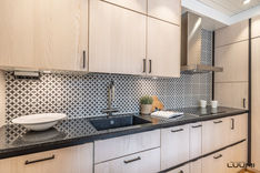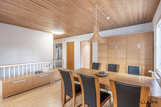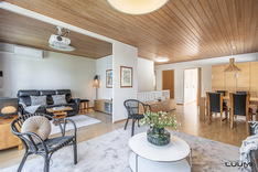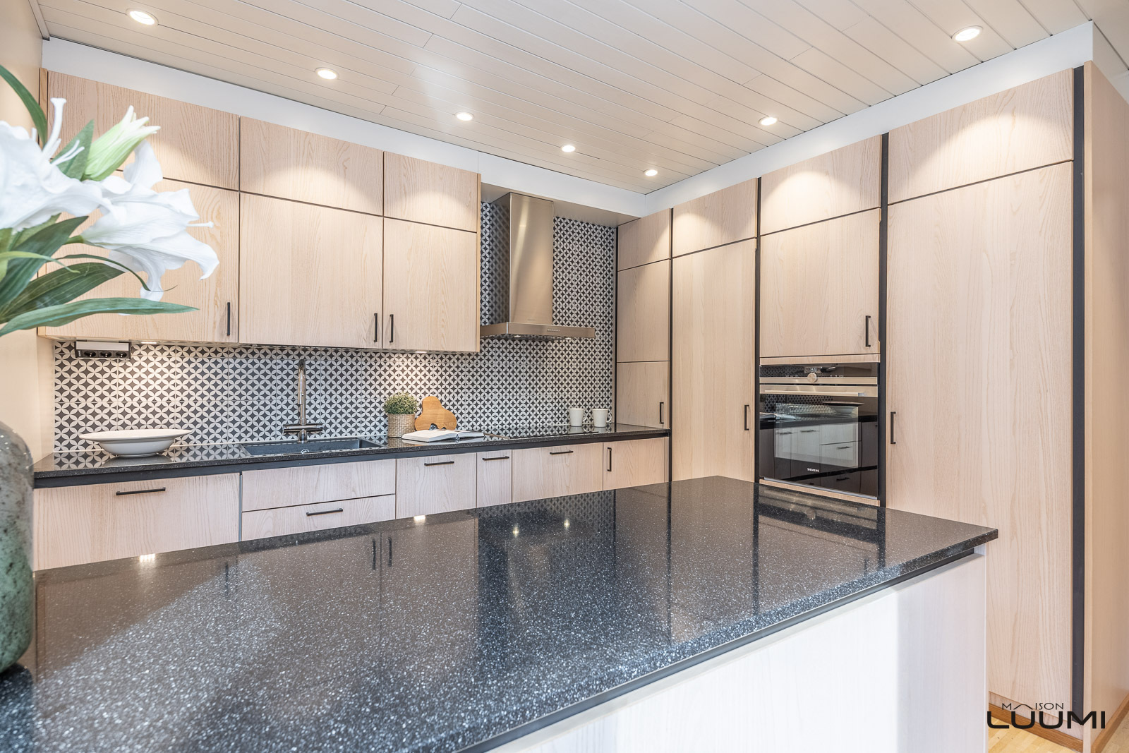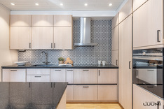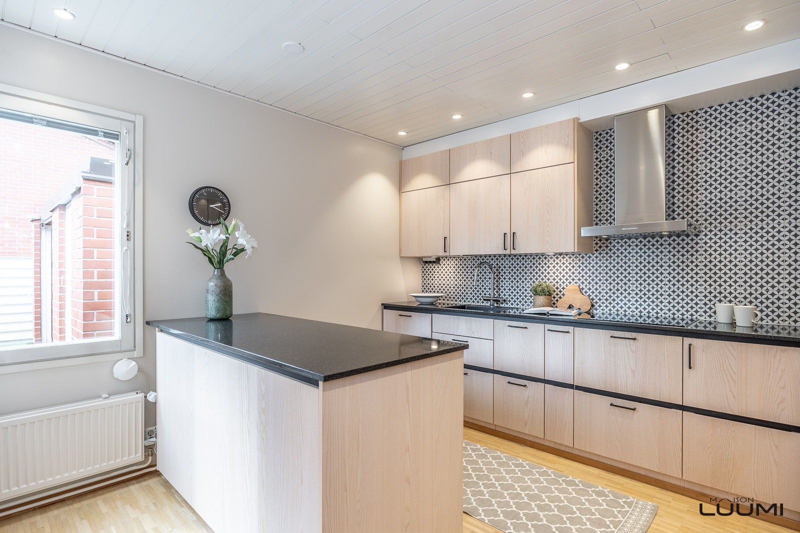 | Kuvaus: | KVIK-keittiön varusteena aamiaiskaappi, täysimittaiset, integroidut jää- ja pakastinkaapit, induktioliesi, erillisuuni, liesituuletin (suodatin), mikroaaltouuni (+uuni), astianpesukone (2025) ja kivitasot. Saareke tuo keittiöön lisää säilytys- ja laskutilaa. Keittiö uusittu 2018. |