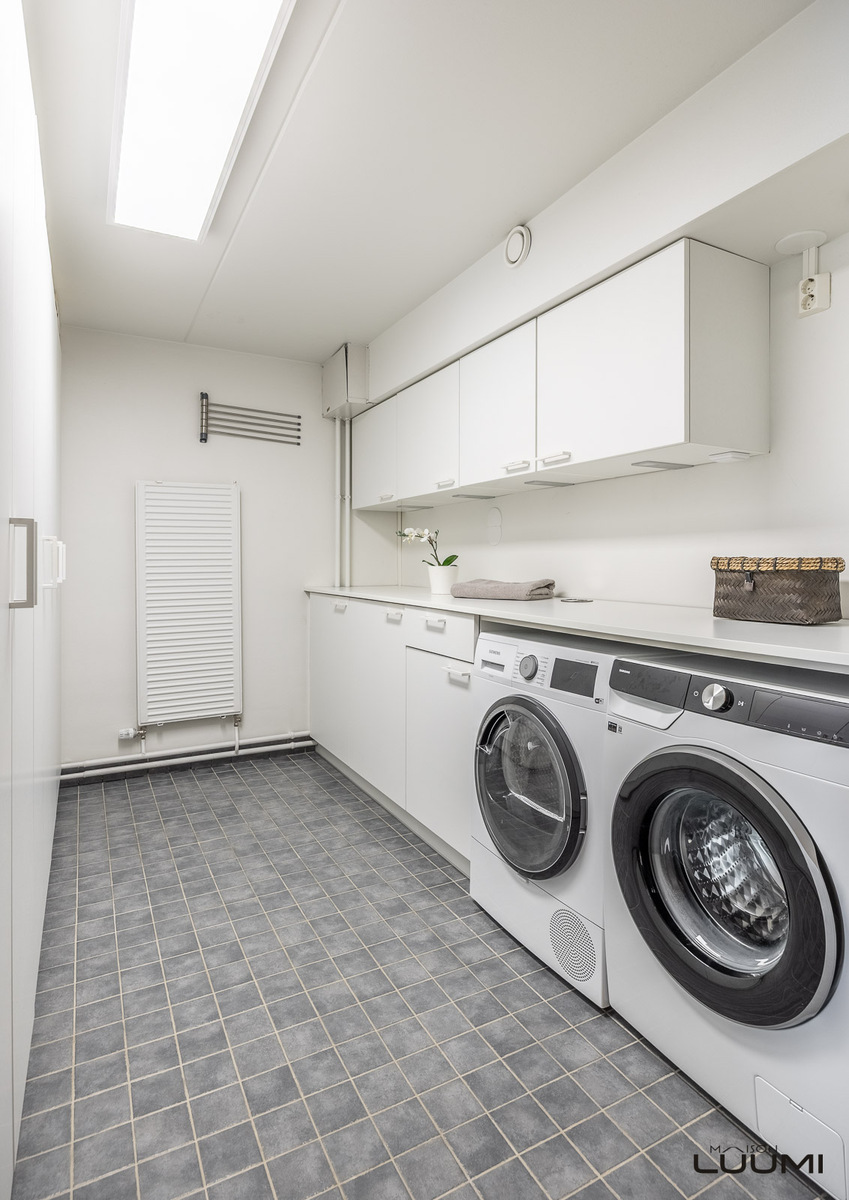 | Kuvaus: | Kodinhoitohuoneessa pesukoneliitäntä sekä hyvin säilytys- ja työskentelytilaa. Lattiamateriaalina laatta. Pinnat maalattu 2018 (seinät ja katto) |