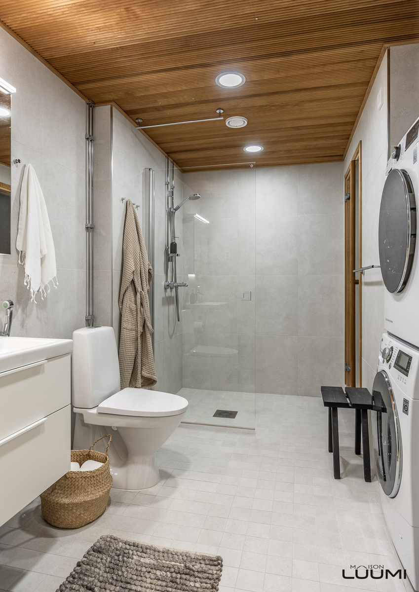 Makuuhuoneet ja lukuisat ikkunat kolmeen ilmansuuntaan kehystävät yhteisiä tiloja, ja pyykkihuolto on keskitetty kauniin kylpyhuoneen yhteyteen. Yhtiön osakkaiden käytössä on myös pesutupa. Kaksi wc:tä ja oma sauna kuuluvat luonnollisesti myös tämän tason kotiin.