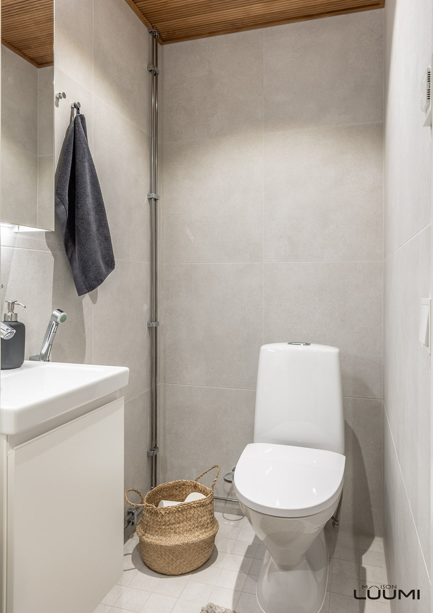 | Kuvaus: | WC-istuimen lisäksi bideesuihku, käsienpesuallas sekä peili- ja allaskaappi. |