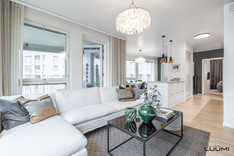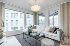 Pohjaratkaisu on toteutettu luonnonvalon ja toiminnallisuuden ehdoilla. Avarat oleskelutilat aukeavat heti eteisestä jatkuen aina lasitetulle länsiparvekkeelle. Vaalea avokeittiö saarekkeineen kelpaa vaativammallekin kokille, ja ruokapöydälle on luontainen paikka keittiön ja olohuoneen yhteydessä. Aurinkoisen kodin asumisviihtyvyyden takaa vesikiertoisen lattialämmityksen ja lattiaviilennyksen yhdistelmä.