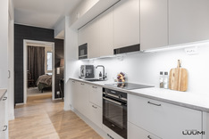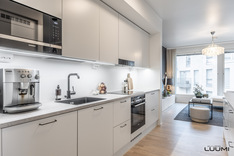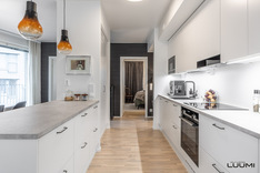 | Kuvaus: | Vaaleassa keittiössä varusteena täysimittaiset jää- ja pakastinkaapit, induktioliesi, erillisuuni, liesituuletin (suodatin), astianpesukone ja mikroaaltouuni. Työtasot laminaattia. Leveä saareke tuo keittiöön lisää säilytys- ja laskutilaa. |