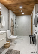 | Kuvaus: | Tilavassa kylpyhuoneessa suihku, suihkuseinä, wc-istuin, bideesuihku, käsienpesuallas, peili- ja allaskaappi. |