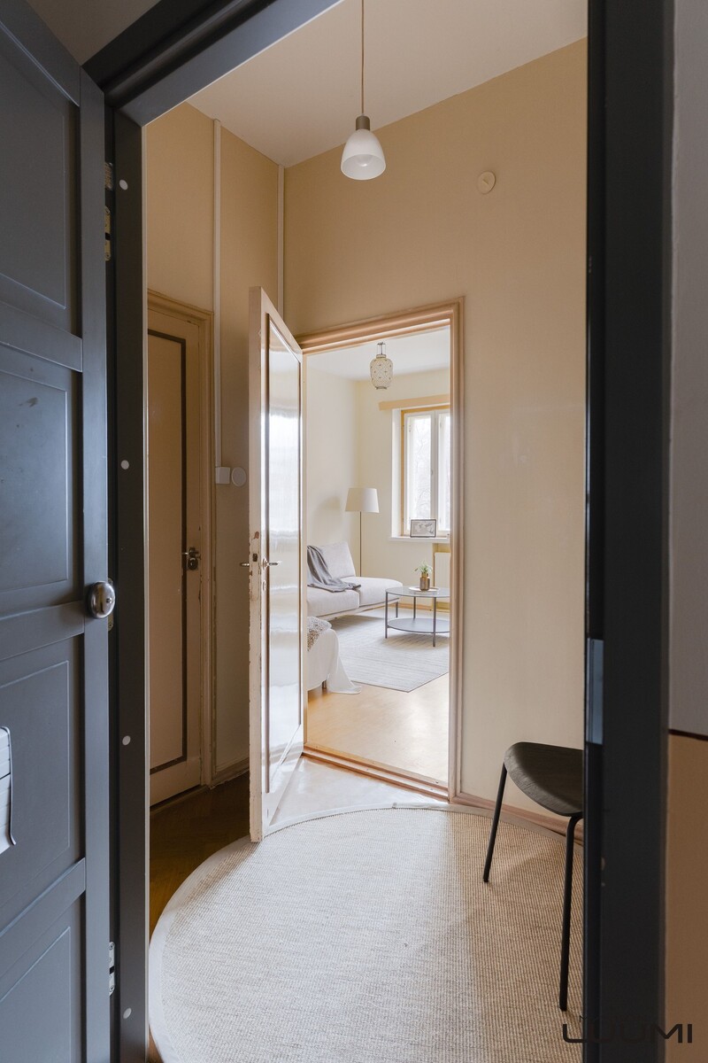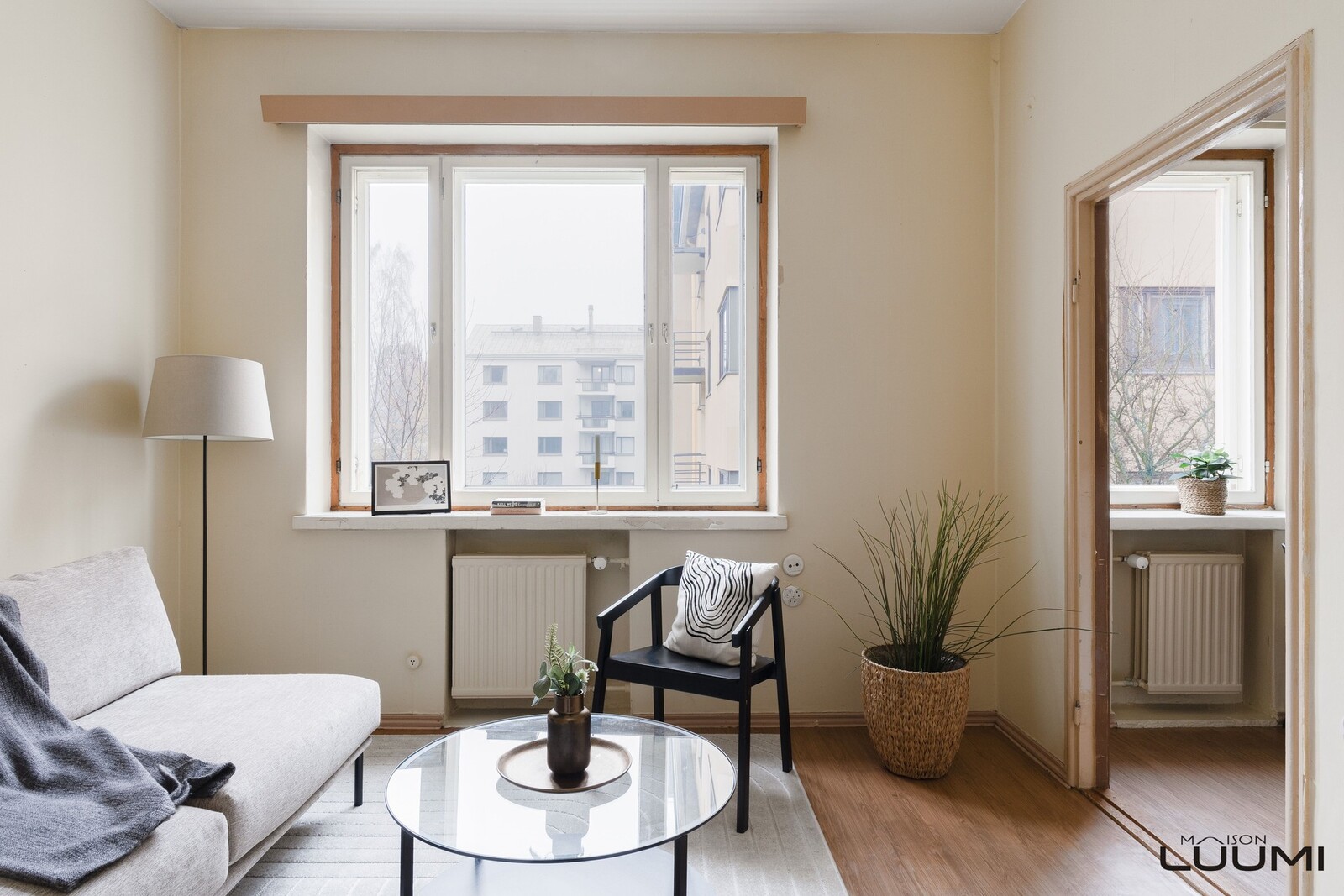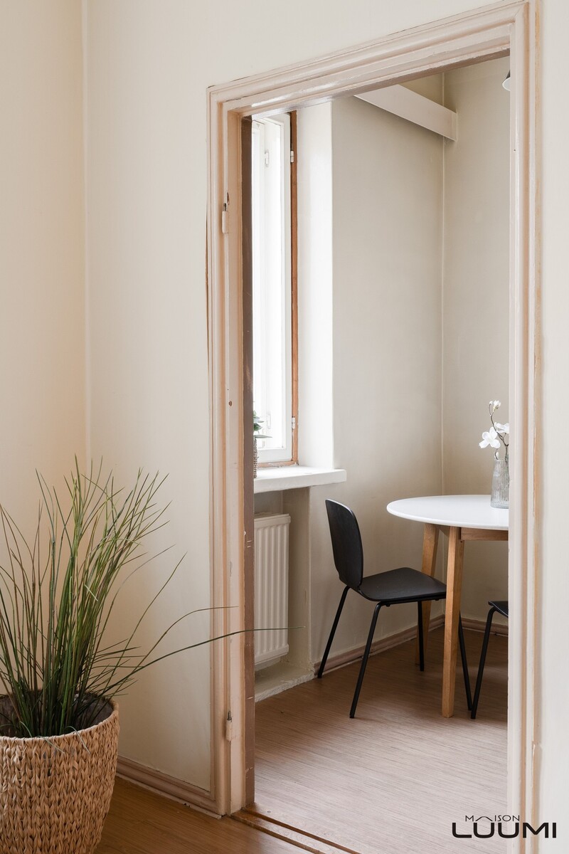 Isot ikkunat viimeistelevät huoneiston viehättävän tunnelman, ja ihastuttavat 1930-luvun ikkunasyvennykset kutsuvat nauttimaan puistomaisista sisäpihanäkymistä. Olohuoneessa on sopivasti tilaa makuupaikalle, ja kodikkaan keittiön yhteyteen mahtuu hyvin ruokapöytä ja ystävät illastamaan. Kaiken kruunaa hiljattain remontoitu, tyylikäs kylpyhuone.