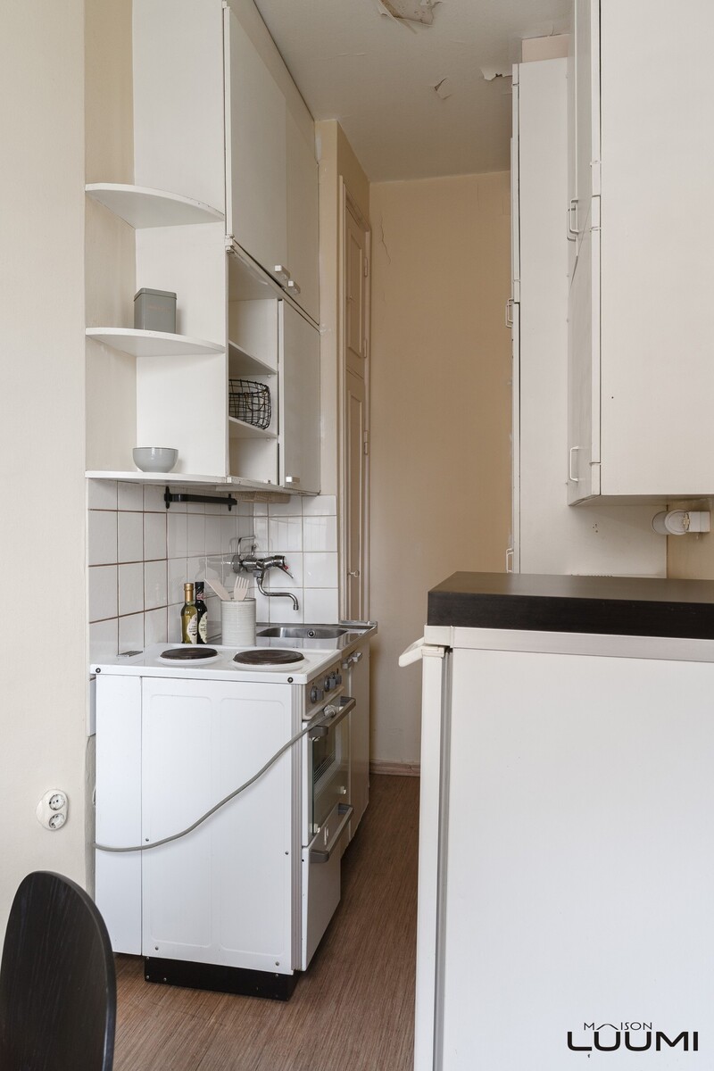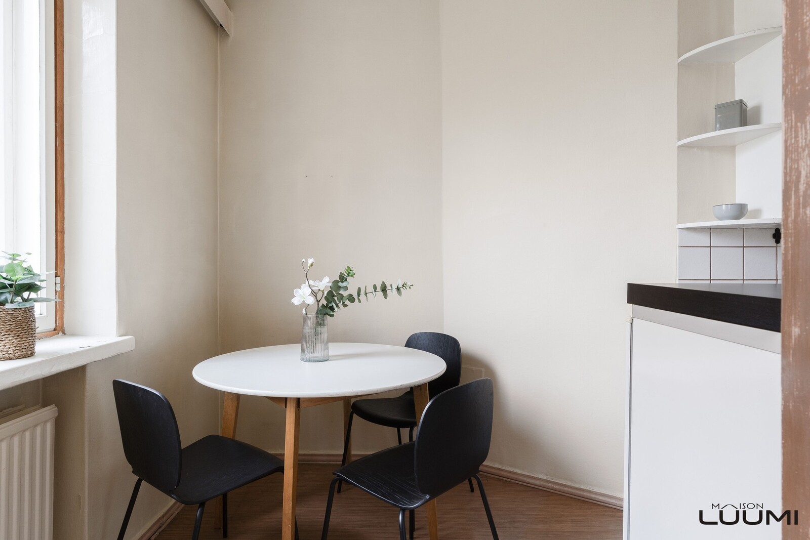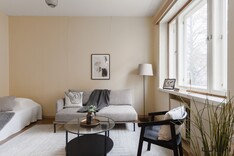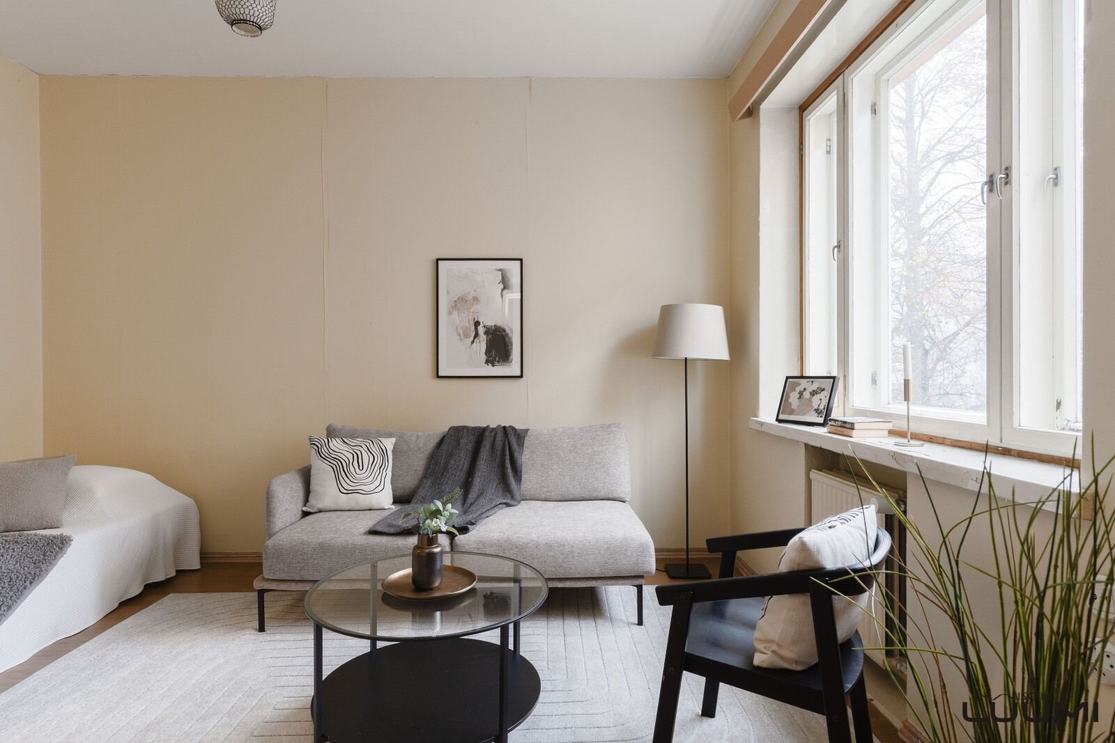 Isot ikkunat viimeistelevät huoneiston viehättävän tunnelman, ja ihastuttavat 1930-luvun ikkunasyvennykset kutsuvat nauttimaan puistomaisista sisäpihanäkymistä. Olohuoneessa on sopivasti tilaa makuupaikalle, ja kodikkaan keittiön yhteyteen mahtuu hyvin ruokapöytä ja ystävät illastamaan. Kaiken kruunaa hiljattain remontoitu, tyylikäs kylpyhuone.