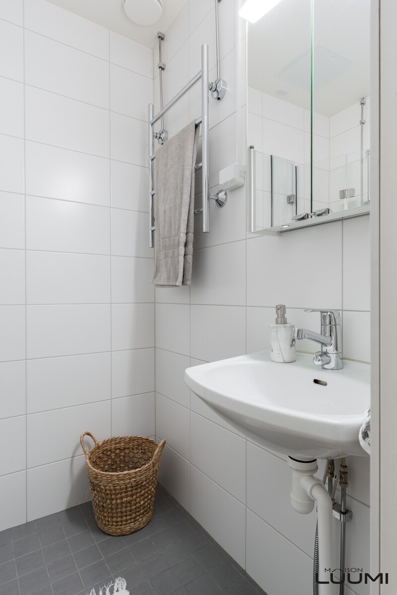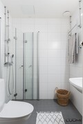 | Kuvaus: | Tyylikäslinjainen kylpyhuone, varusteina: suihku, kääntyvät lasiset suihkuovet, wc-istuin, pesuallas, peilikaappi, pyyhekuivain. Uusittu taloyhtiön toimesta vuonna 2020. |