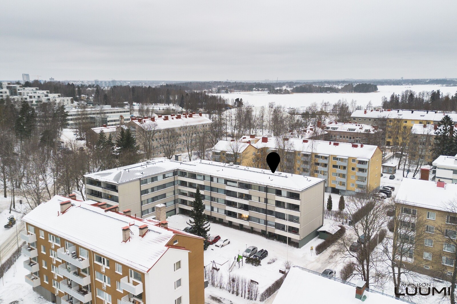 Tehoneliöinen kolmio hissitalon kolmannesta kerroksesta. Läpitalon valoisa koti aivan Myllykallion koulun vierestä.