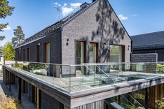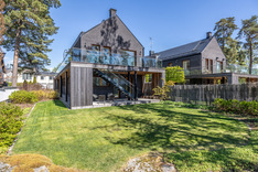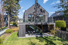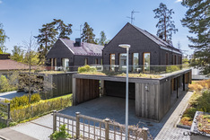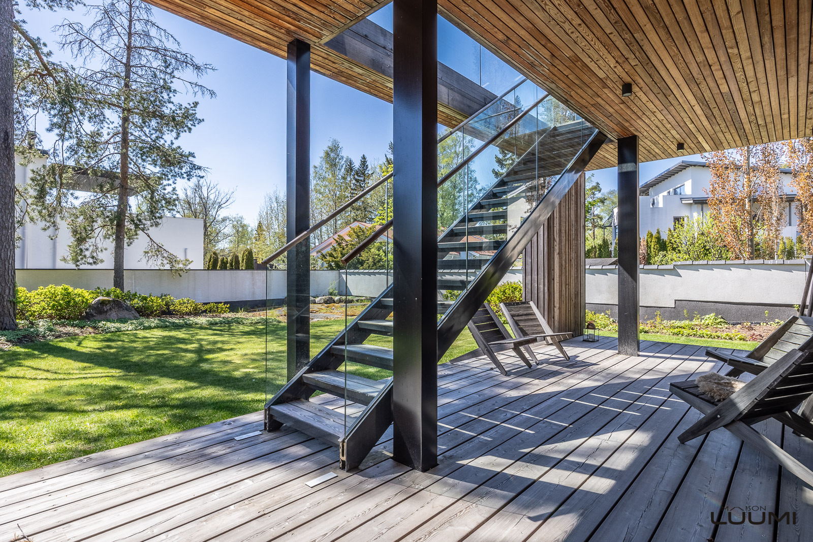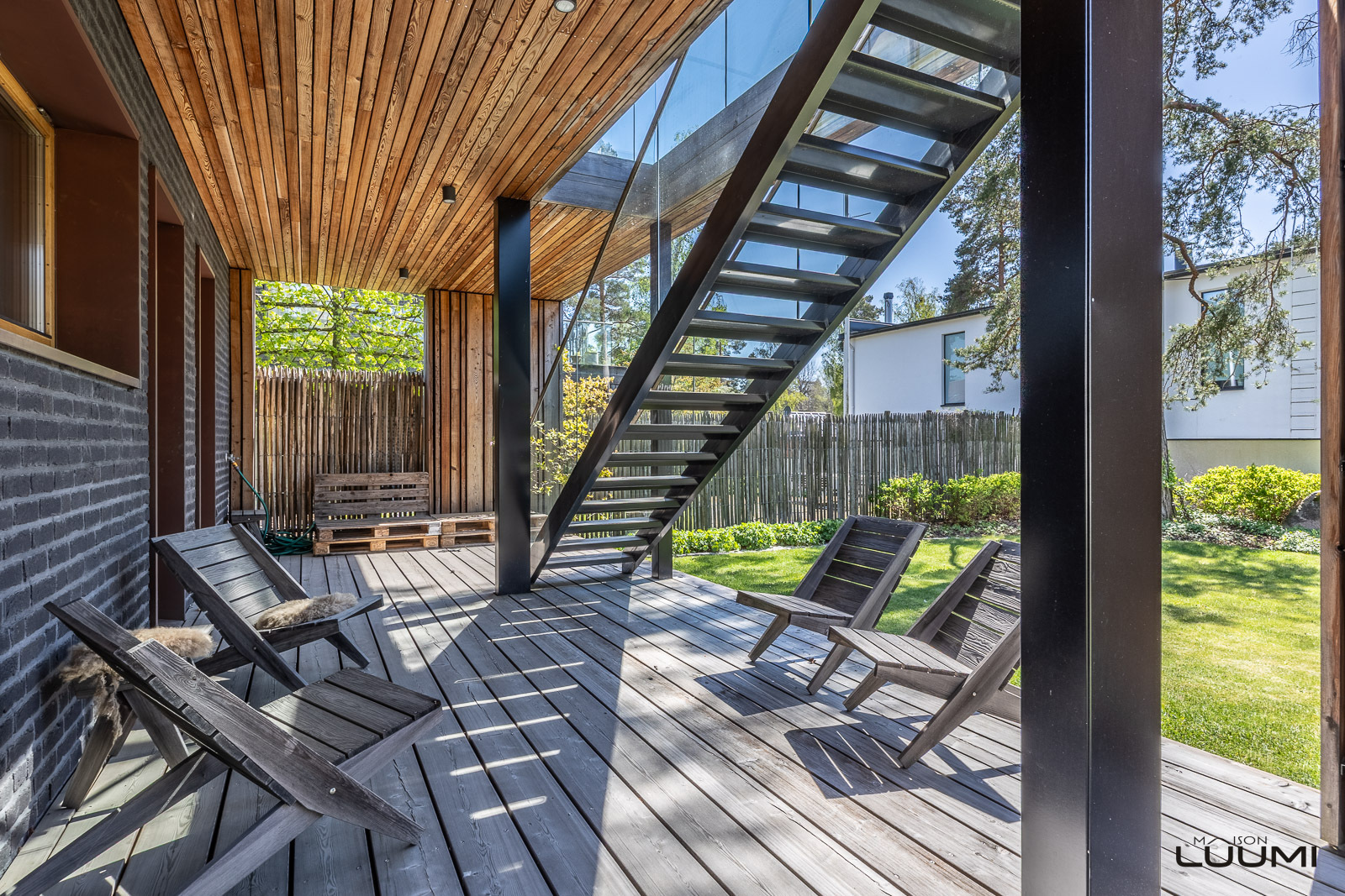 Talon useat kylpyhuoneet on toteutettu samalla rohkealla tyylillä, ja hieno amme täydentää jokaisen saunakokemuksen. Kaiken kauneuden keskellä ei toiminnallisuutta ole unohdettu: autokatoksesta pääsee suoraan sisään, oleskelutiloja on molemmissa kerroksissa ja säilytystilaa on kerrankin tarpeeksi.