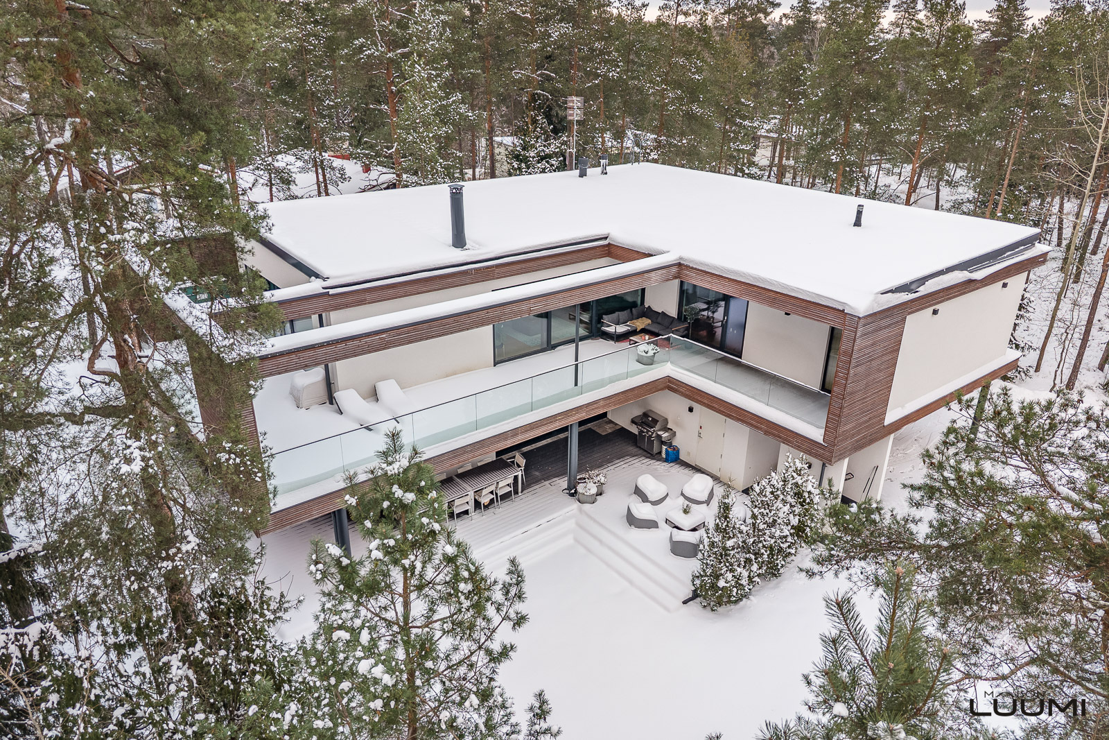 Ensivaikutelma on vaikuttava, kun eteisaulasta aukeaa esteettömät näkymät ulos ja talon näyttävään oleskelutilaan. Olohuone, keittiö ja ruokailutila muodostavat avarat, isojen ikkunoiden kehystämät yhteiset tilat, jotka jatkuvat hulppealle aurinkoterassille. Harmoninen kokonaisuus on täydellisen elegantti ja toimiva. Suojaisa sijainti tontin sisäpuolella tuo pihalla viihtymiseen paljon kaivattua yksityisyyttä.