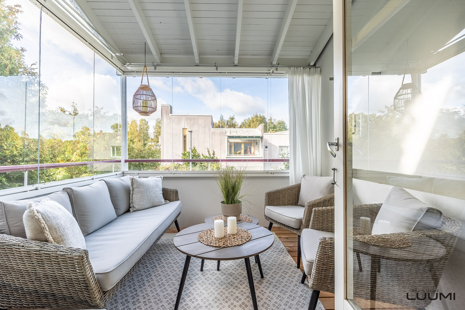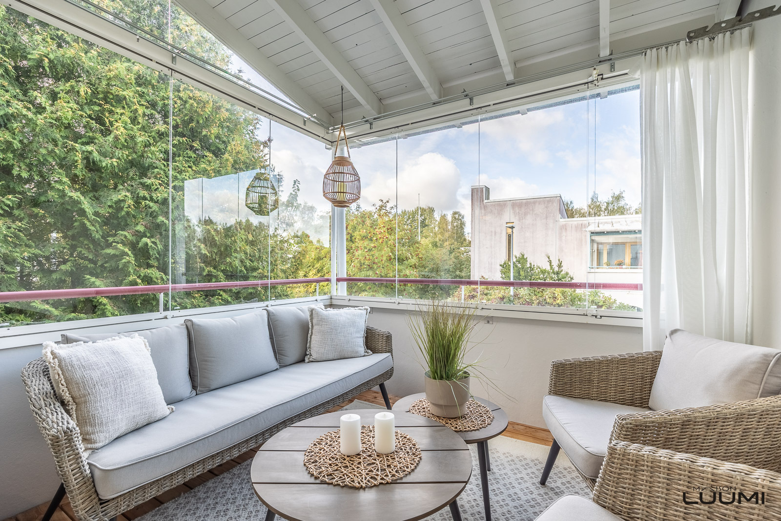 Ilmojen salliessa on upea lasitettu länsiparveke yksi kodin lempitiloja, jossa saa nautiskella kuulaista illoista.