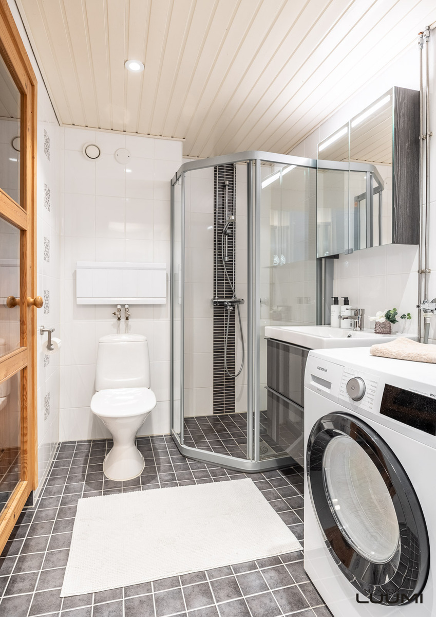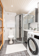 | Kuvaus: | Suihkuseinä, wc-istuin, peilikaappi ja kattospotit (2022), allaskaappi, paikka pesutornille. |