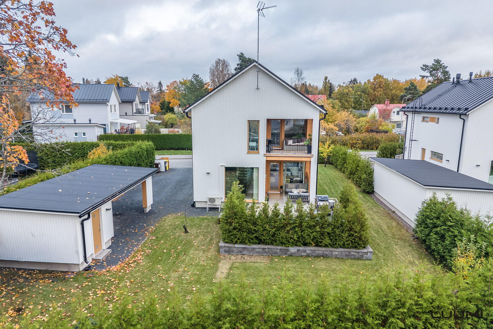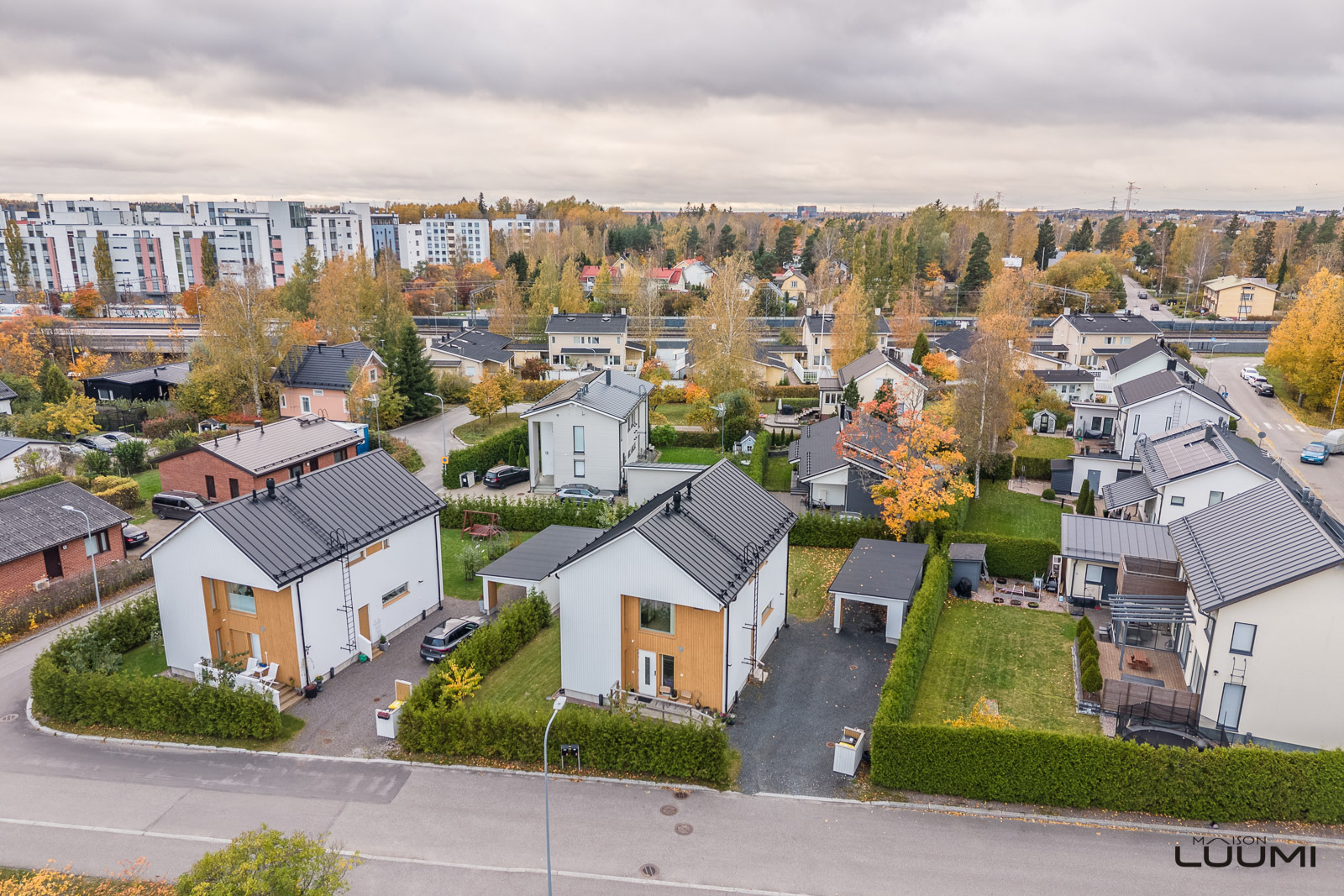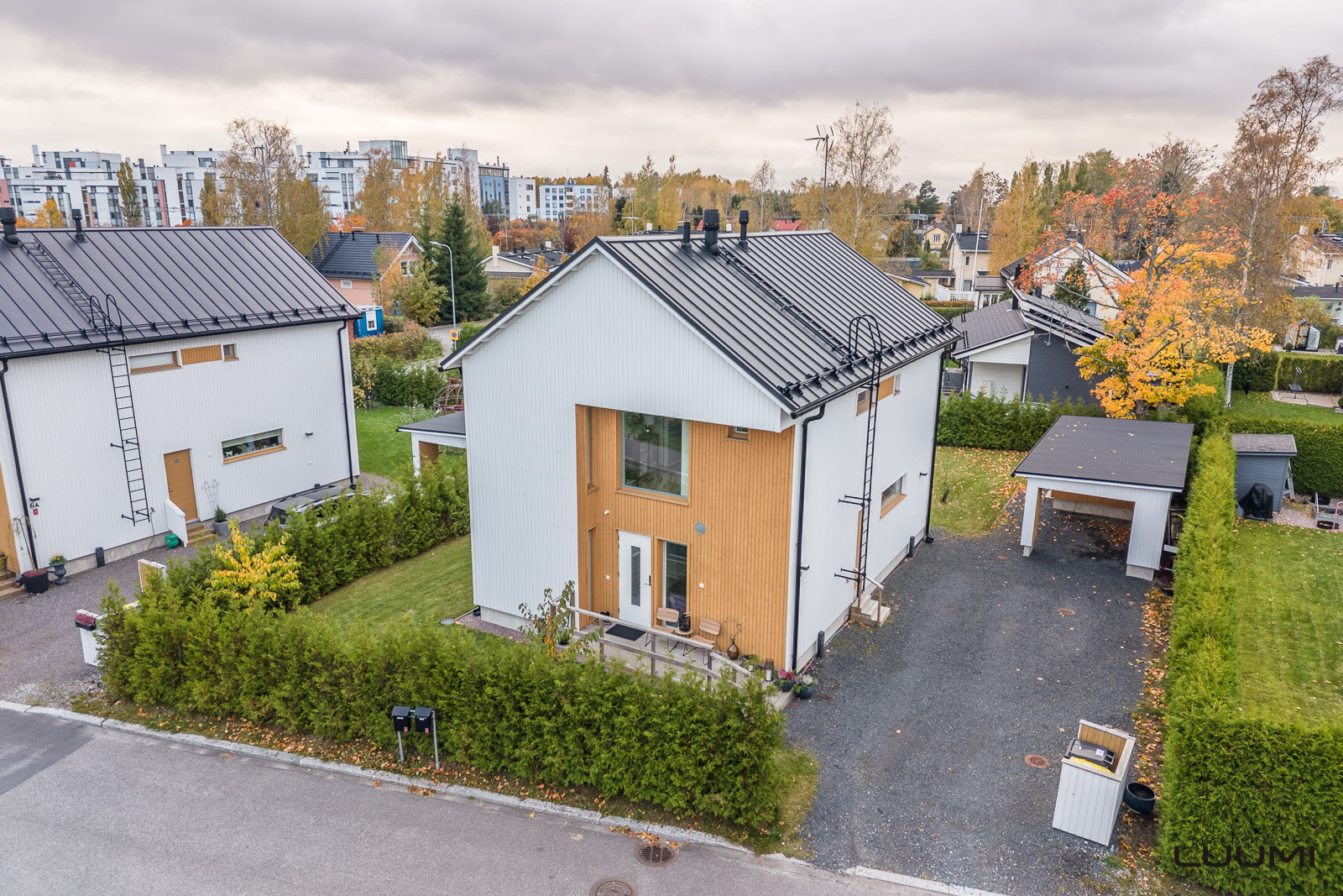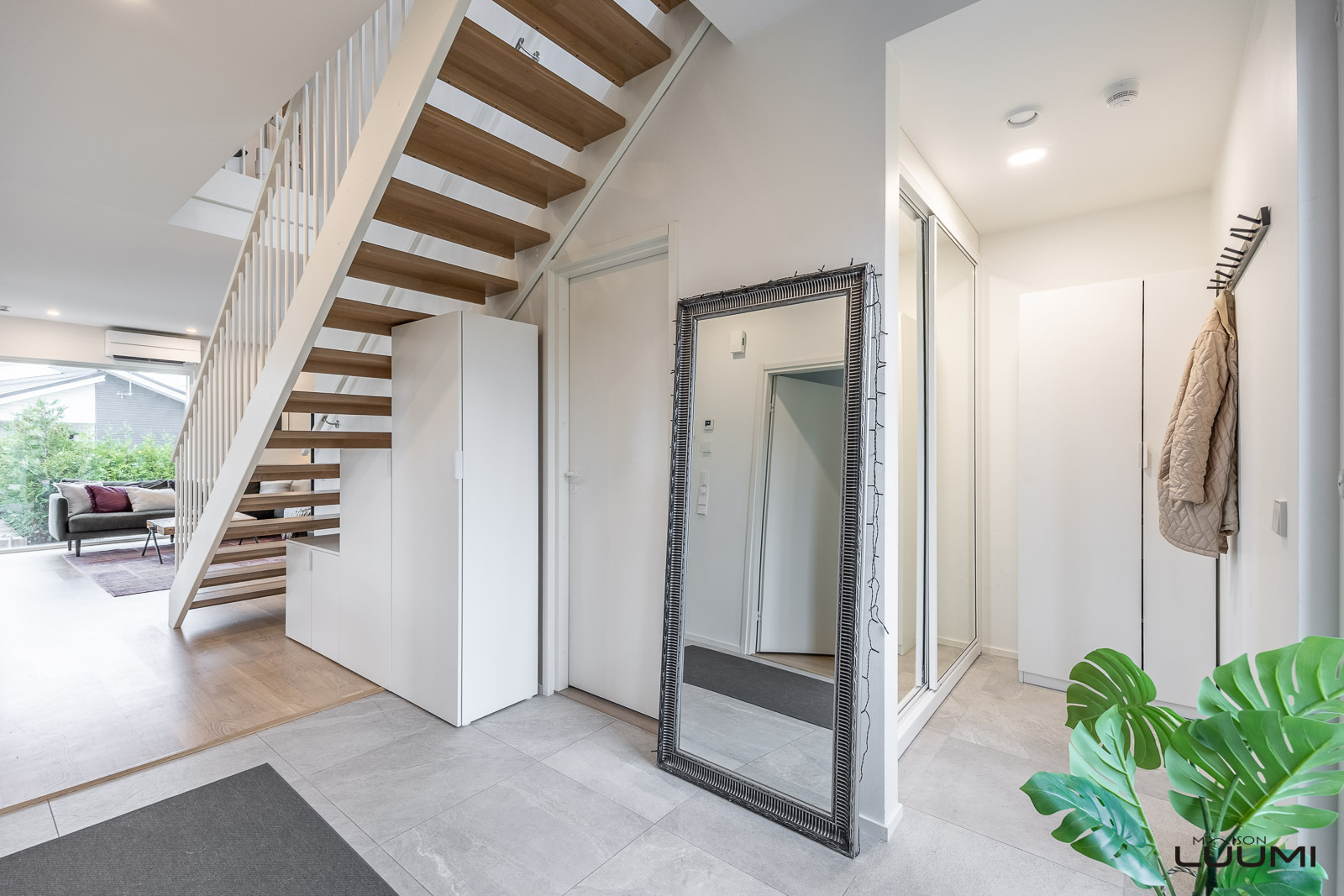 Talo sijaitsee helppohoitoisella tontilla päättyvän tien varrella. Kiinteistömuotoinen asuminen on sovittu selkeästi erillisellä hallinnanjakosopimuksella ja tonttiosuus on mahdollista lunastaa omaksi. Puhdaslinjainen kokonaisuus, jonka lämmitysmuotona on poistoilmalämpöpumppu. Huoletonta asumista ilman remonttihuolia!