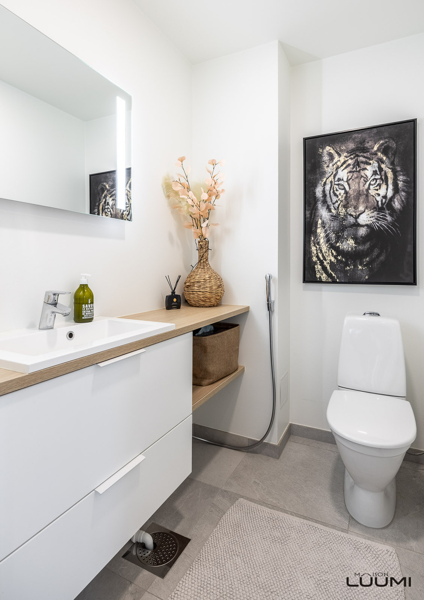 | Kuvaus: | Tilava erillinen wc alakerrassa. WC-istuimen lisäksi bideesuihku, käsienpesuallas, peili ja allaskaappi. |