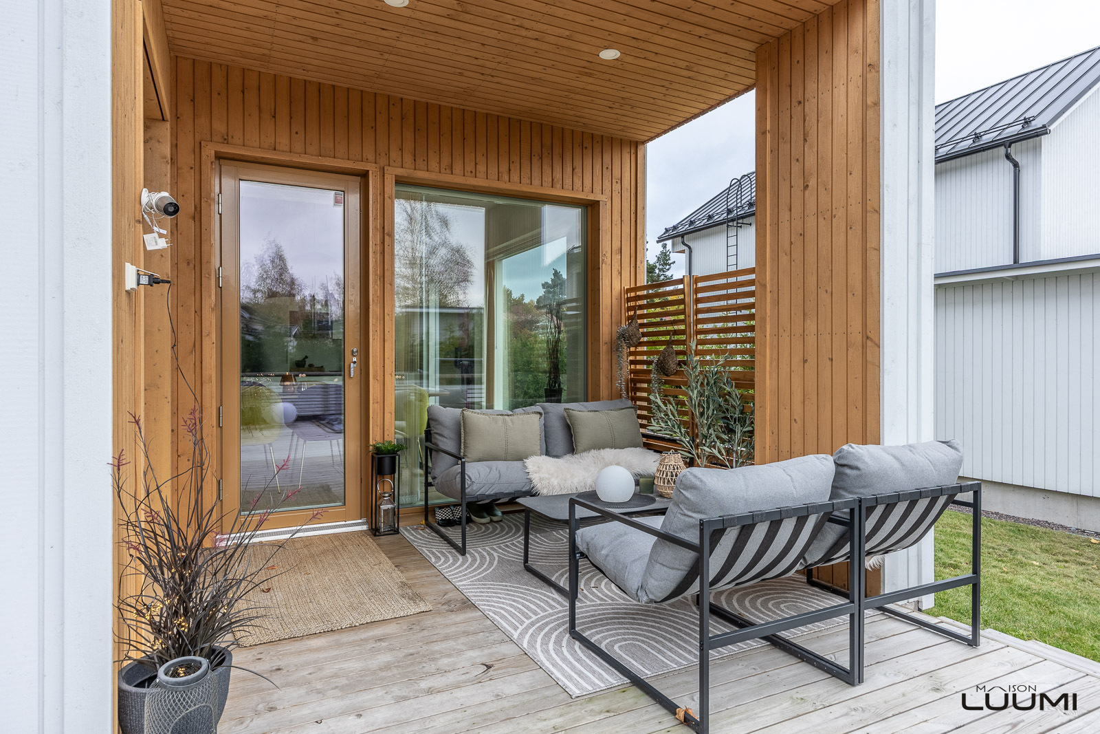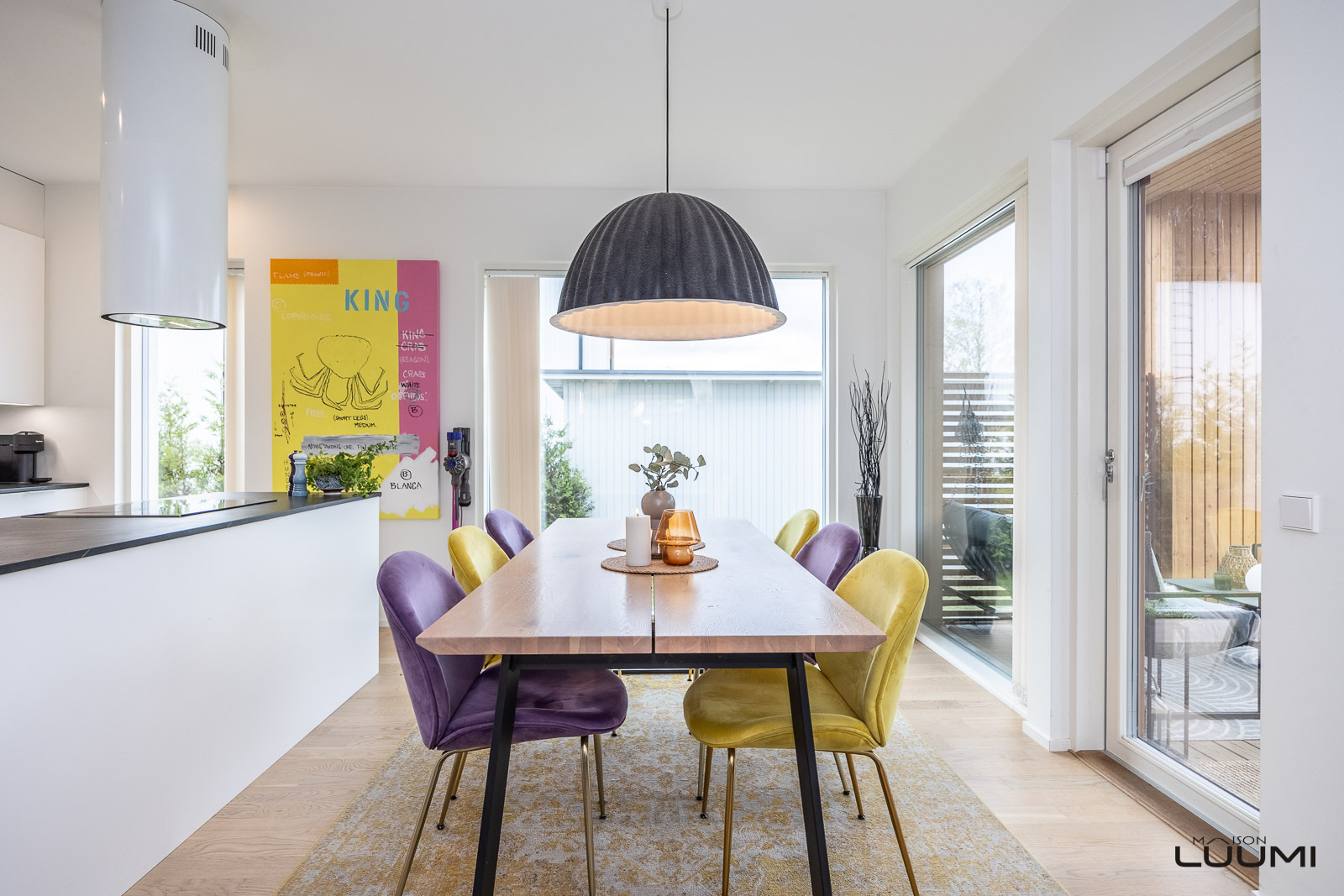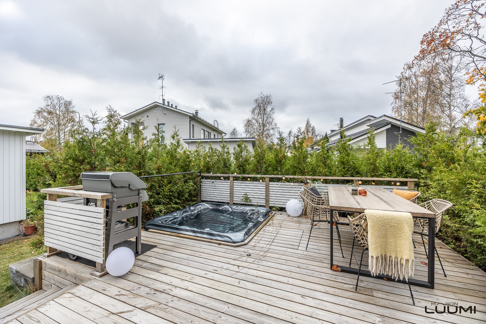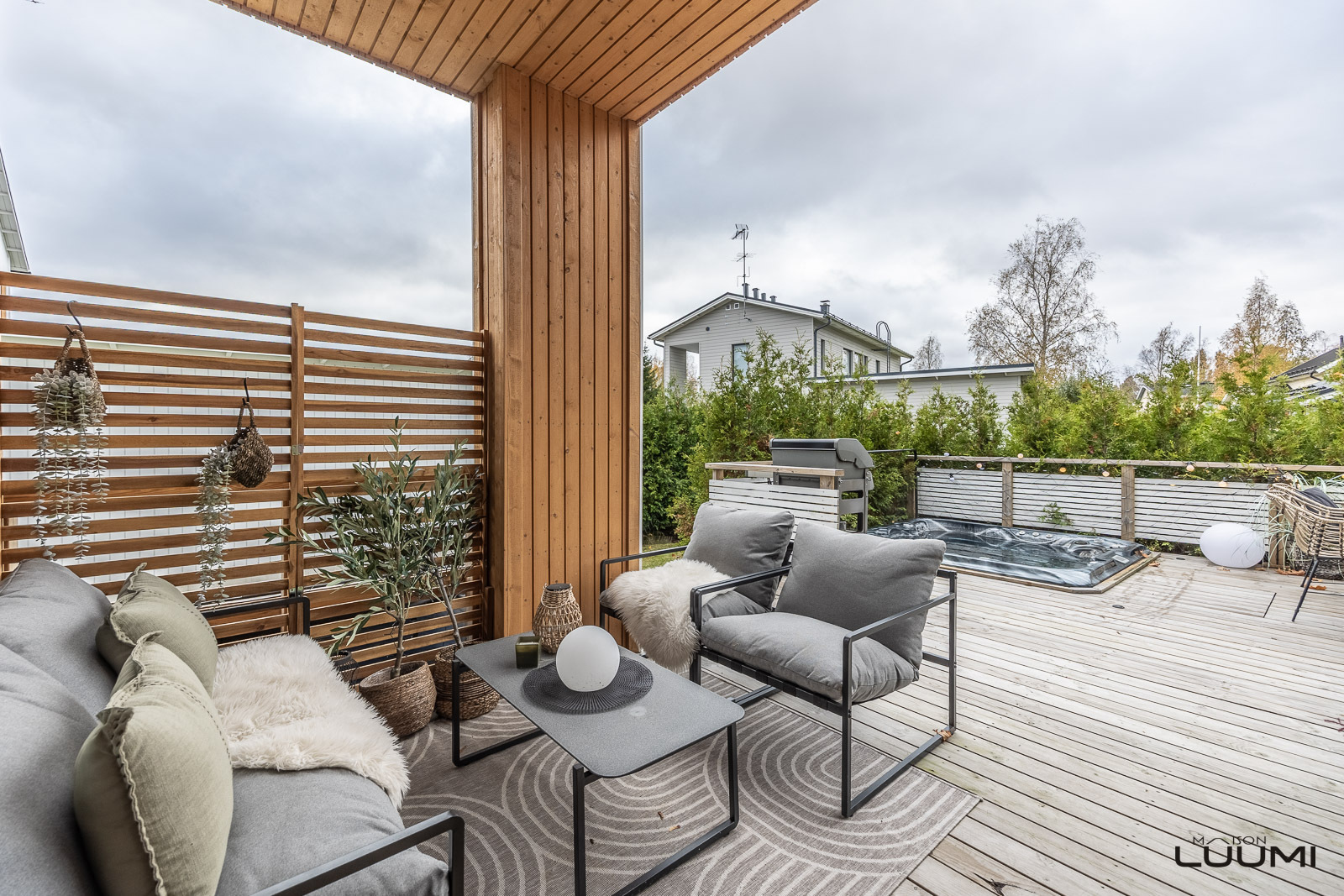 Yhteisten oleskelutilojen valoisuus ja tilaratkaisu ilahduttaa moderniudellaan. Ikkunat ovat isot ja luonnonvalo saa tulvia anteliaasti sisään. Upea avokeittiö saarekkeineen on huolella suunniteltu ja antaa hyvän syyn kutsua ystävät syömään, tehdä ruokaa pitkään ja kattaa kauniisti. Iso aurinkoterassi tuo runsaasti lisäarvoa kesäpäivistä nauttimiseen. Suojaisan pihan kruunaa laadukas poreamme.