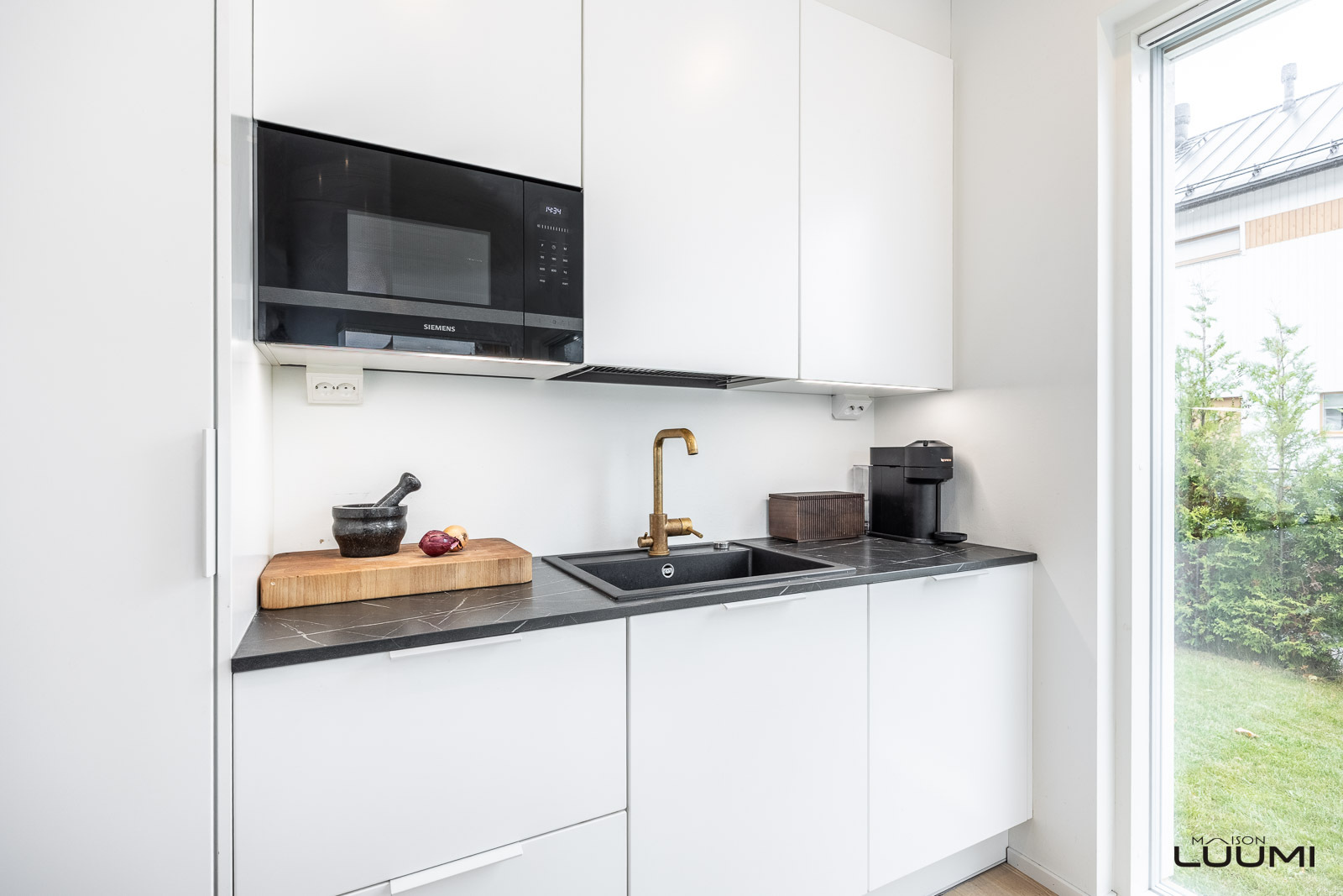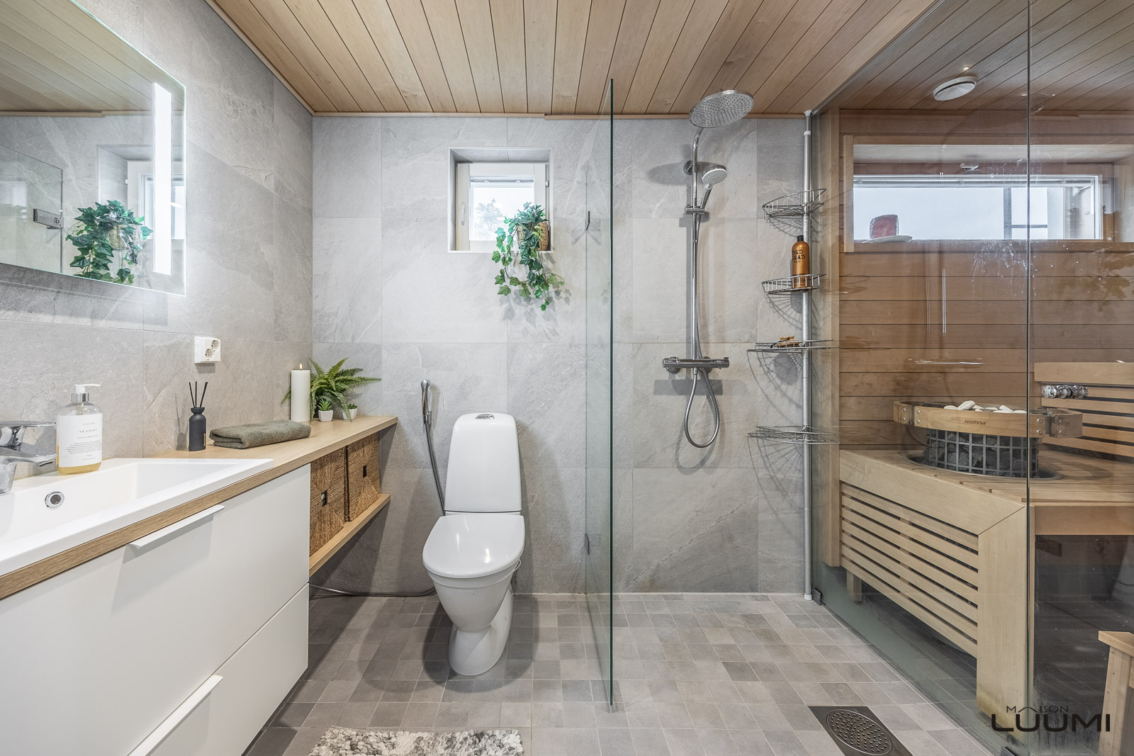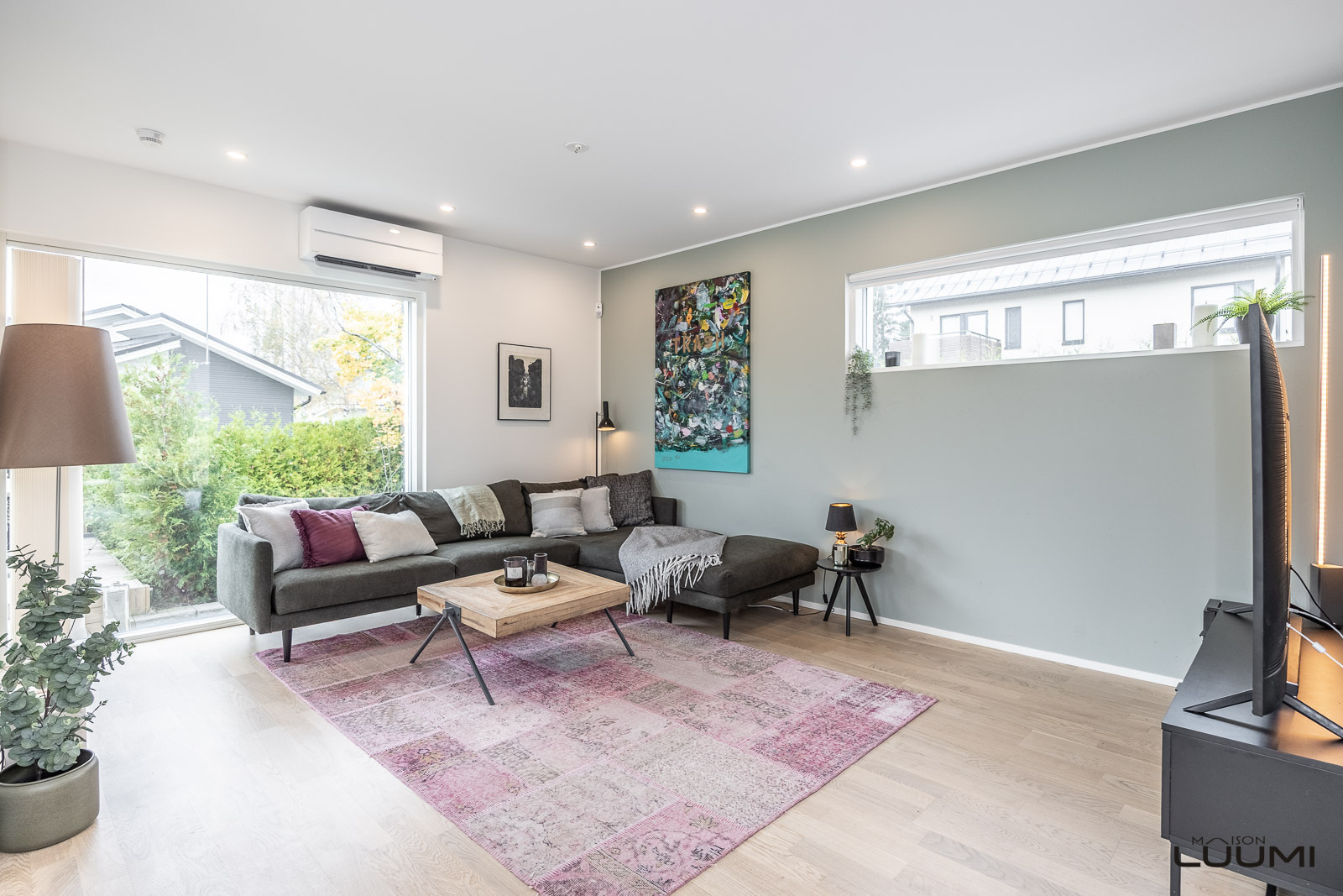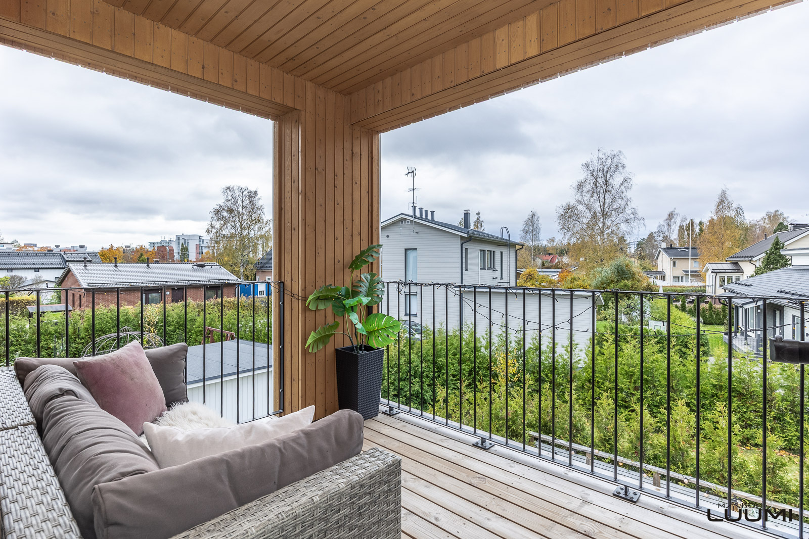 Yhteisten oleskelutilojen valoisuus ja tilaratkaisu ilahduttaa moderniudellaan. Ikkunat ovat isot ja luonnonvalo saa tulvia anteliaasti sisään. Upea avokeittiö saarekkeineen on huolella suunniteltu ja antaa hyvän syyn kutsua ystävät syömään, tehdä ruokaa pitkään ja kattaa kauniisti. Iso aurinkoterassi tuo runsaasti lisäarvoa kesäpäivistä nauttimiseen. Suojaisan pihan kruunaa laadukas poreamme.