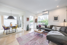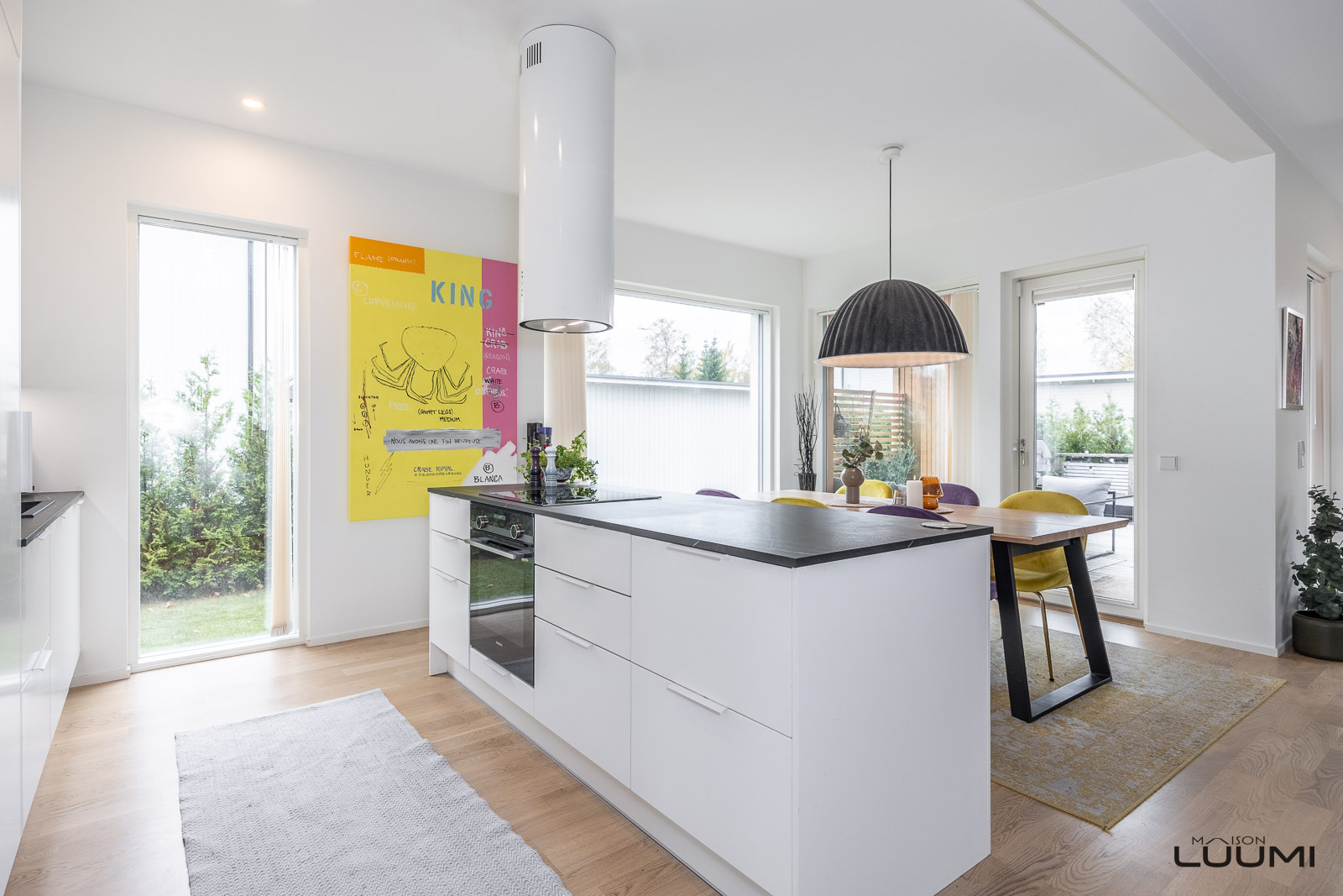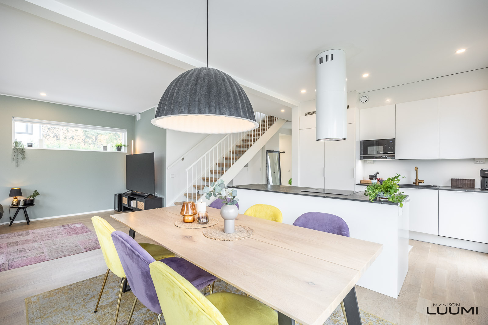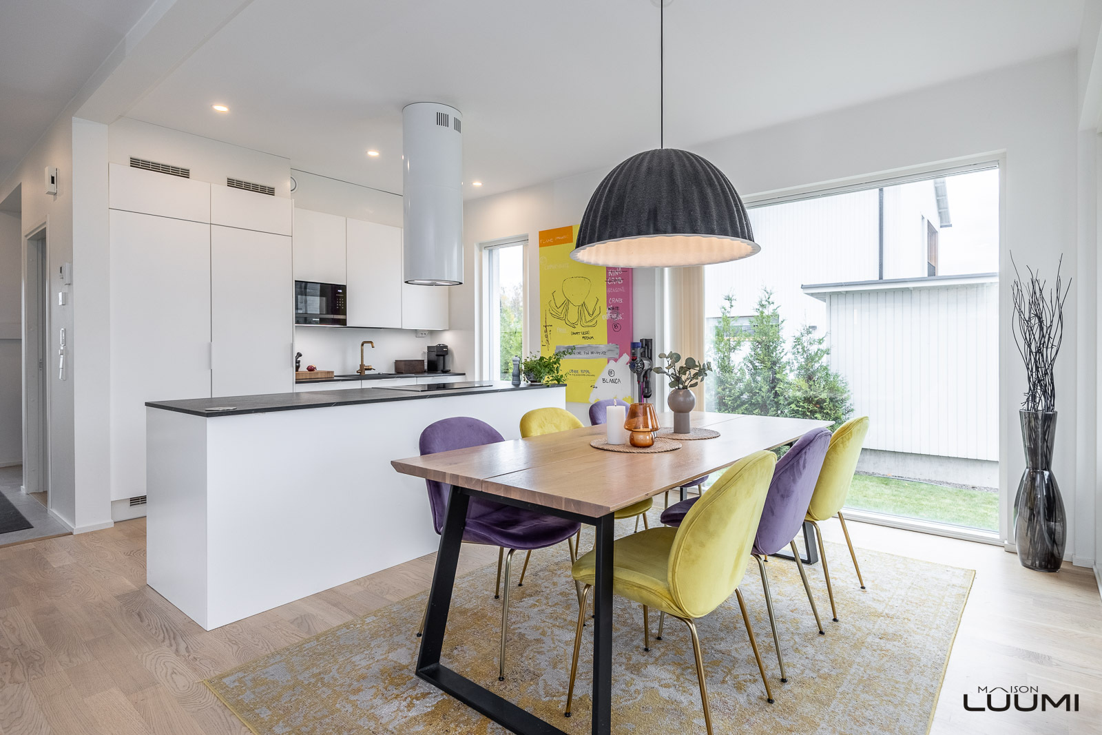 | Kuvaus: | Olohuone yhtenäistä tilaa avokeittiön ja ruokailutilan kanssa. |