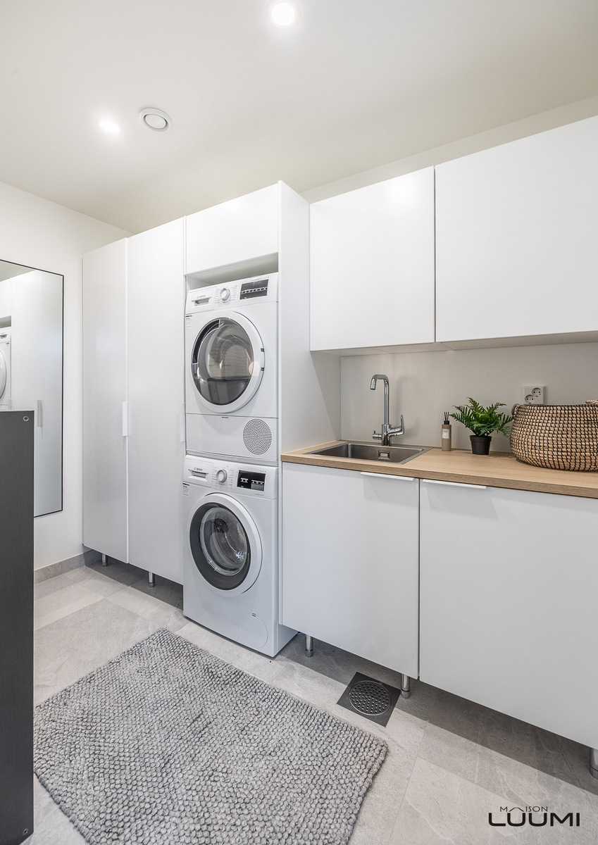 | Kuvaus: | Kodinhoitohuoneessa vesipiste, pesukoneliitäntä sekä hyvin säilytys- ja työskentelytilaa. |