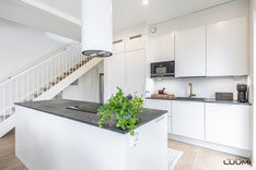 | Kuvaus: | Vaaleassa avokeittiössä täysimittaiset jää- ja pakastinkaapit, induktioliesi, erillisuuni, liesituuletin (hormiin), astianpesukone ja mikroaaltouuni. Saareke tuo keittiöön lisää säilytys- ja laskutilaa. Keittiökoneet Siemens, työtasot laminaattia. Keittiö jatkuu ruokailutilaan, käynti terassille. |