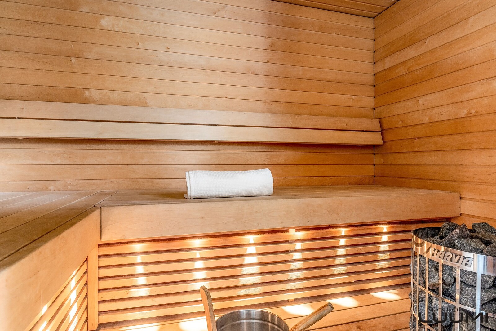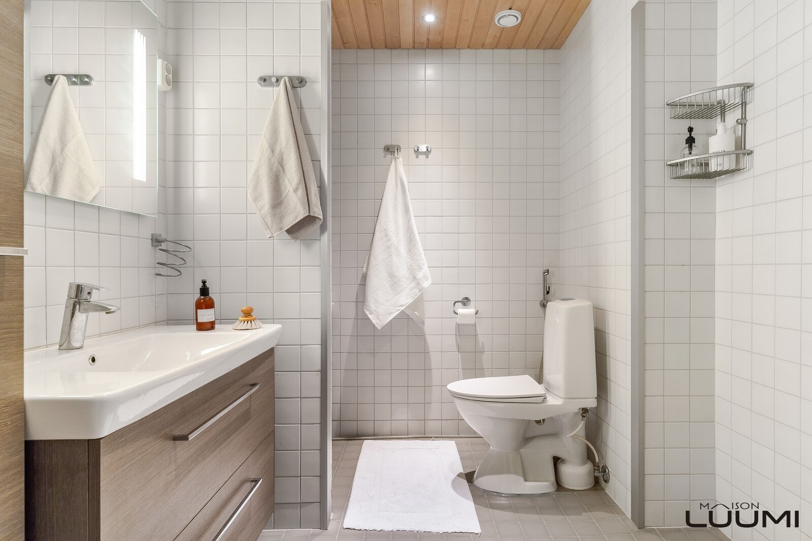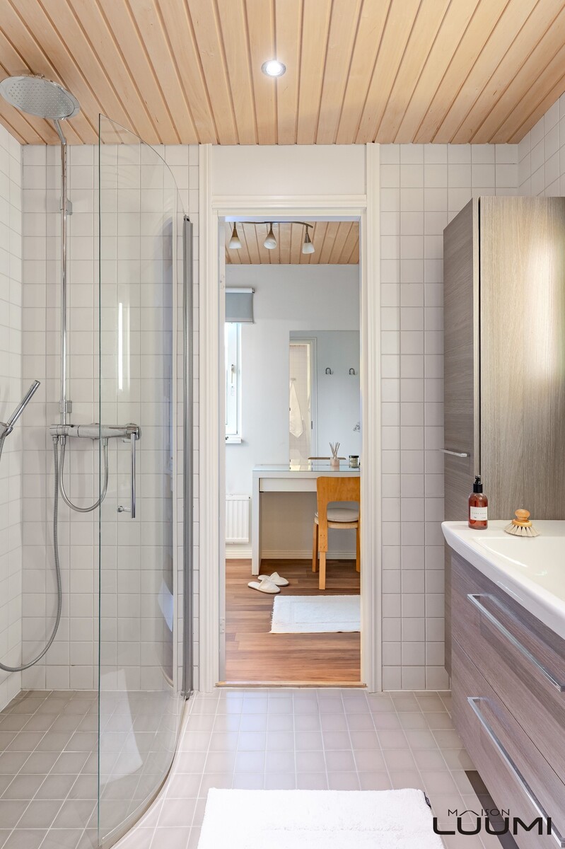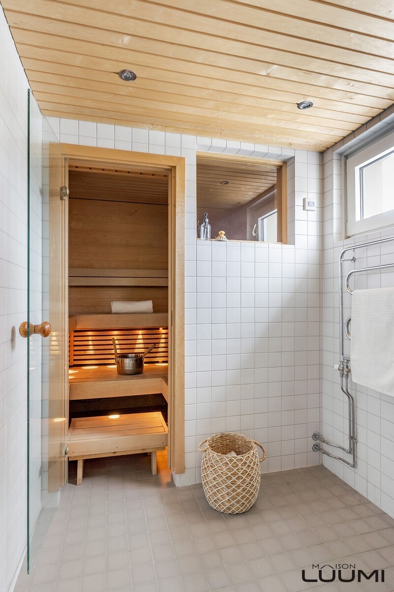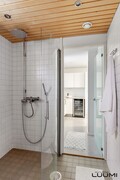 | Kuvaus: | Saunan yhteydessä olevassa ikkunallisessa kylpyhuoneessa sadesuihku, suihkuseinä, upotettu hylly ja pyyhekuivain. Toisessa kylpyhuoneessa suihku, wc-istuin, kaksi käsienpesuallasta ja peili- ja kylpyhuonekaappi. |