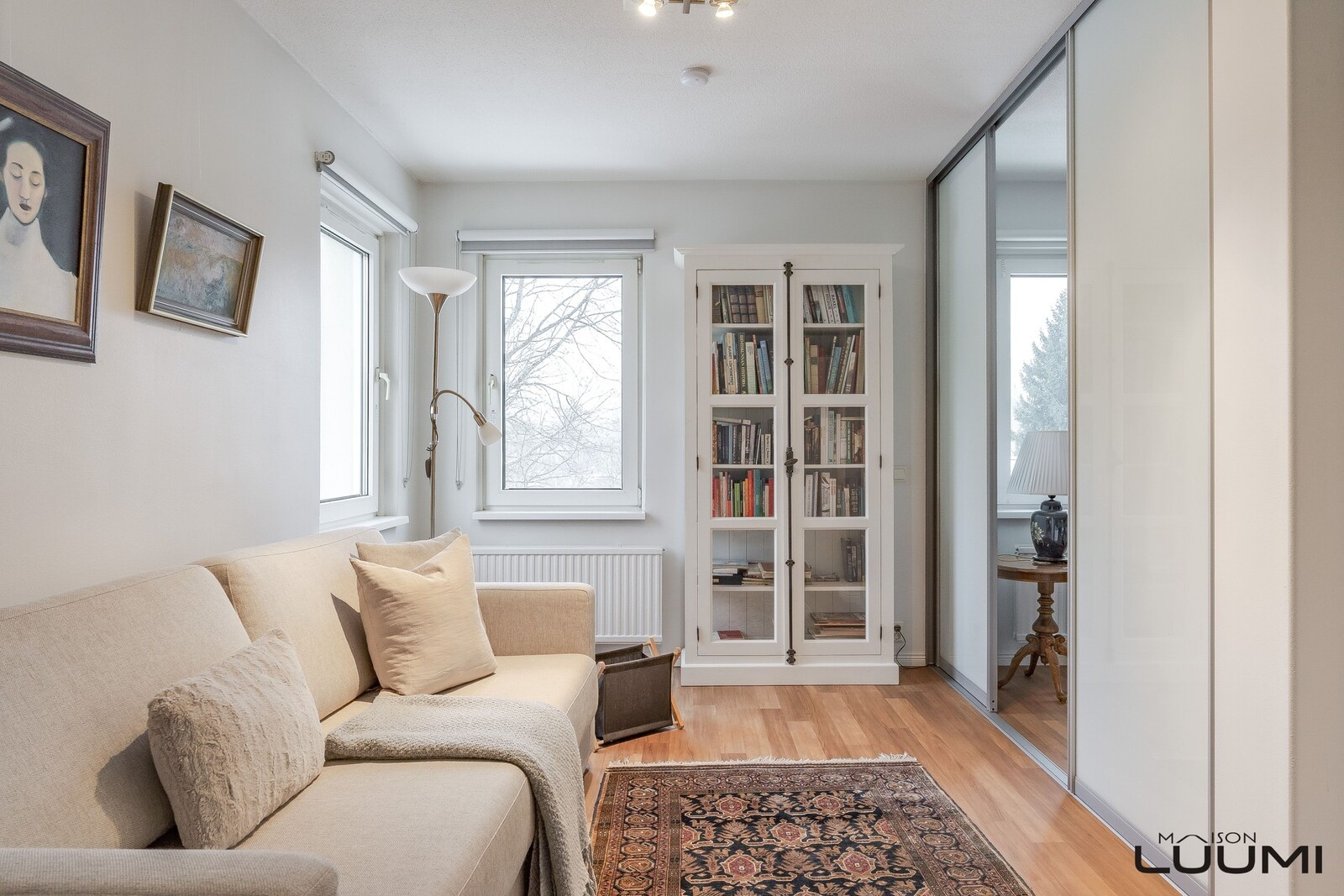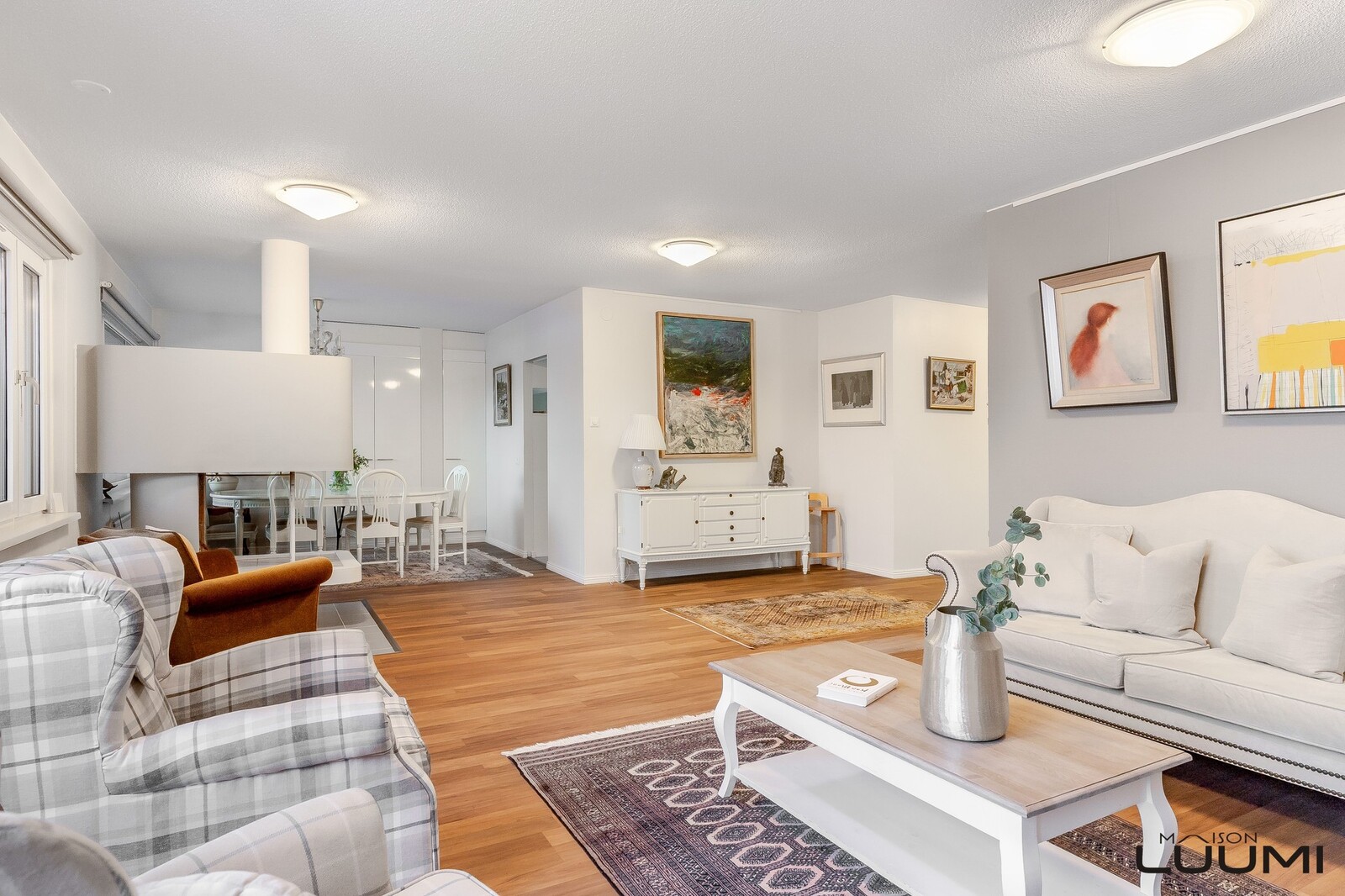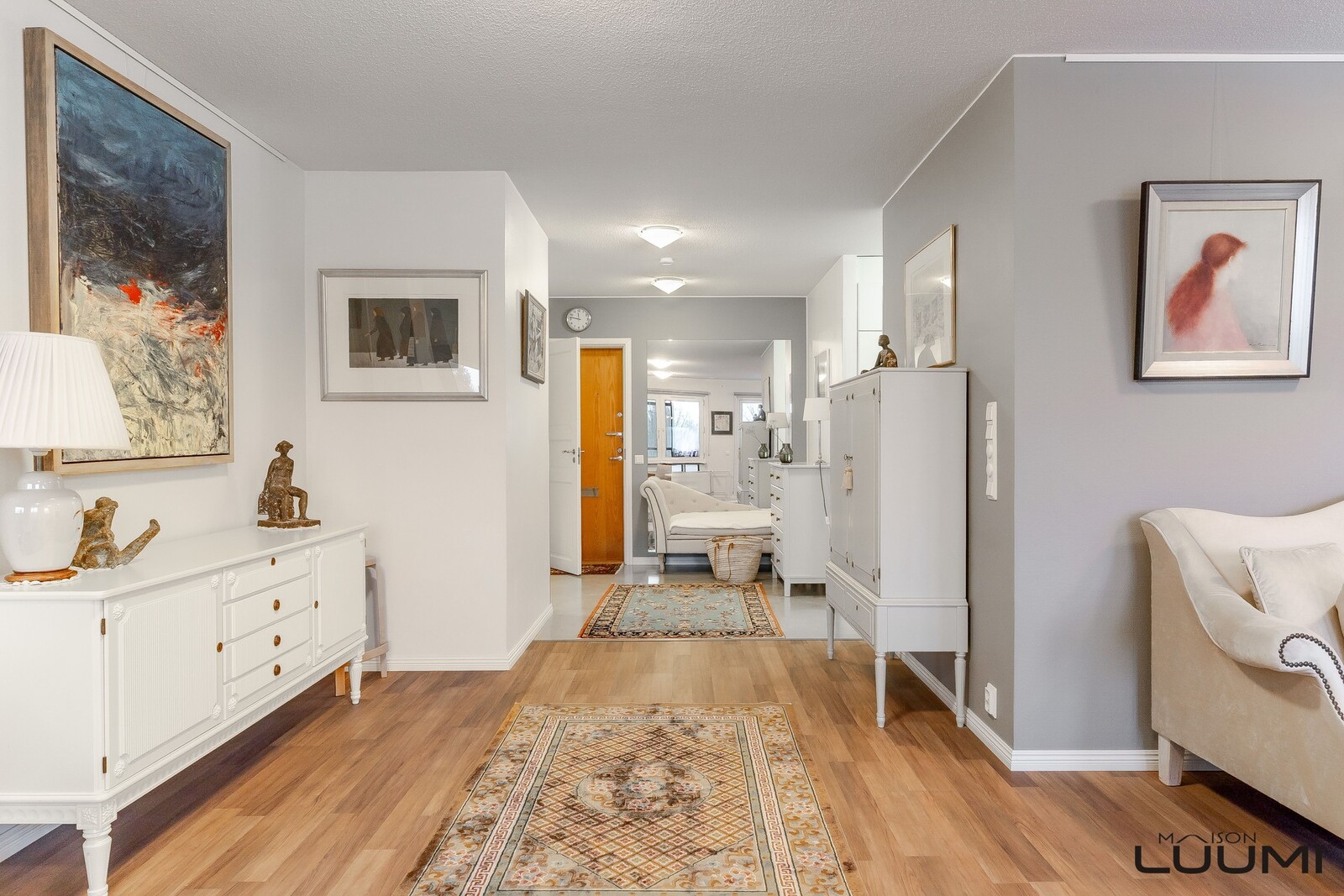 Huikean valoisa hissitalon ylimmän kerroksen päätyhuoneisto merellisestä Haukilahdesta. Täydellisen harmoninen koti erillisellä autotalliosakkeella laatutietoiselle perheelle.