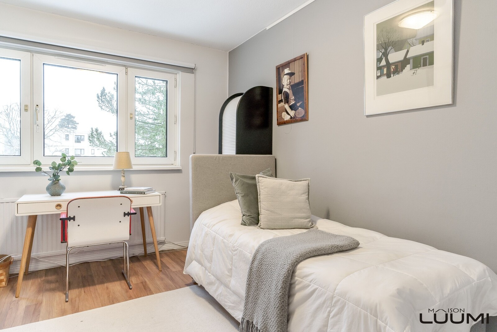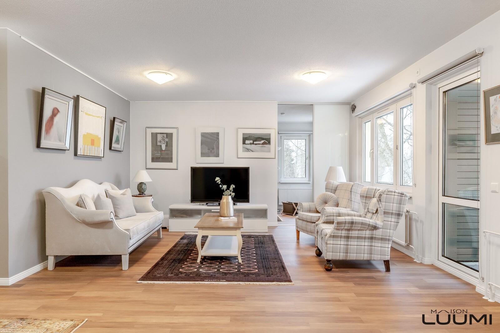 Kolme makuuhuonetta, todella runsaat säilytystilat ja kaksi kylpyhuonetta ovat monelle varmasti mieluisia ominaisuuksia uutta kotia valittaessa. Lasitettu parveke antaa kivat tilat grillailulle, ja tarjoaa vehreät maisemat pitkälle.