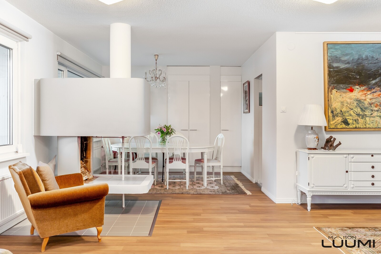 Isompi ruokapöytä on sijoitettuna asunnon paraatipaikalle ollen olohuoneen kanssa avaraa, yhtenäistä tilaa. Kaunis takka jakaa luontevasti eri toiminnot toisistaan.