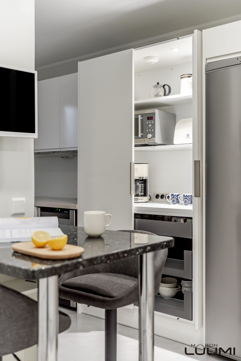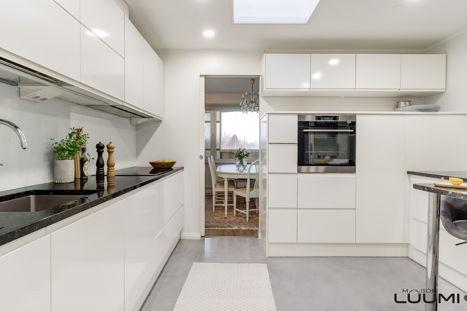 | Kuvaus: | Puustellin keittiö on täysin uusittu vuonna 2019. Luonnonvaloa tuova kattoikkuna, aamiaiskaappi, täysimittaiset jää- ja pakastinkaapit, viinikaappi, induktioliesi, liesituuletin (plasmasuodatin), erillisuuni ja astianpesukone (Gaggenau). Työtasot kiveä, pieni aamiaispöytä. |