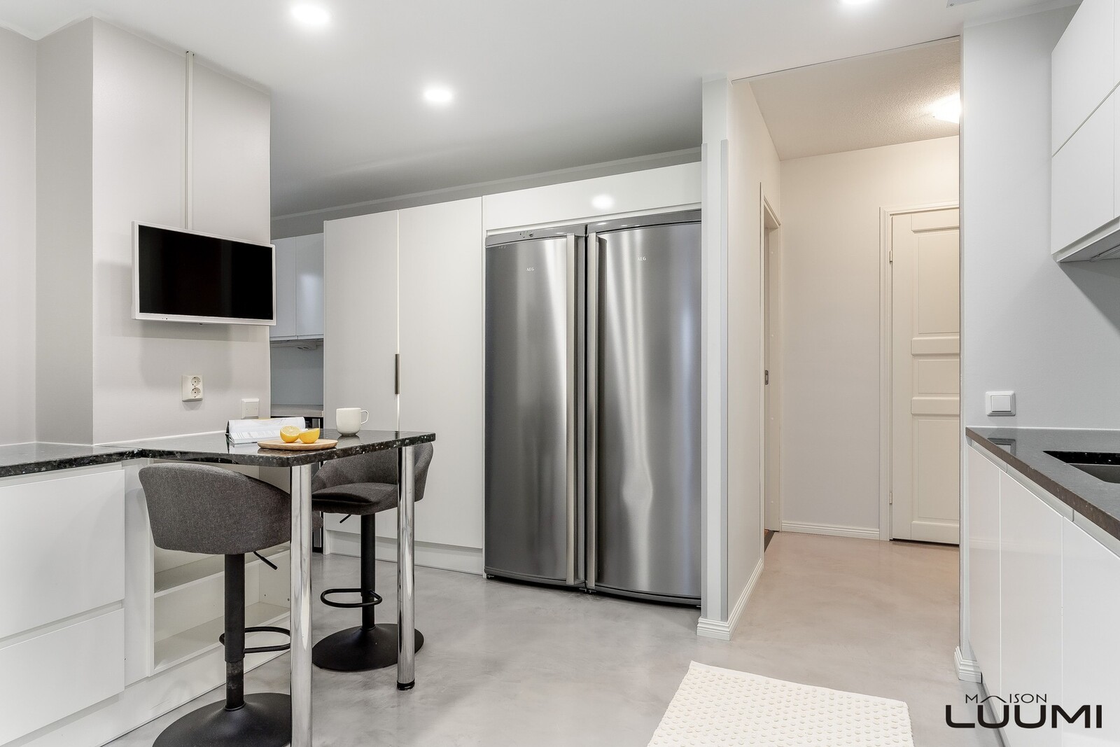 Yhtiön isoimman huoneiston pohjaratkaisu on todella toimiva. Huoneistoa on uusittu vuosien mittaan ja voit muuttaa sisään ilman suurempia kunnostuksia. Moderni Puustelli-keittiö kivitasoineen on varustettu aivan kaikilla herkuilla. Iso keittiö on tarkkaan mittojen mukaan paikalle suunniteltu ja jokainen sentti on hyötykäytössä. Muutostöiden yhteydessä on myös pyykkihuollolle saatu järkevät tilat.