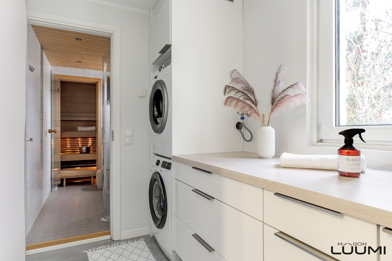 | Kuvaus: | Keittiön yhteydessä kodinhoidolle varattu tila. Pesukoneliitäntä sekä hyvin säilytys- ja työskentelytilaa. |