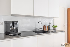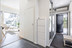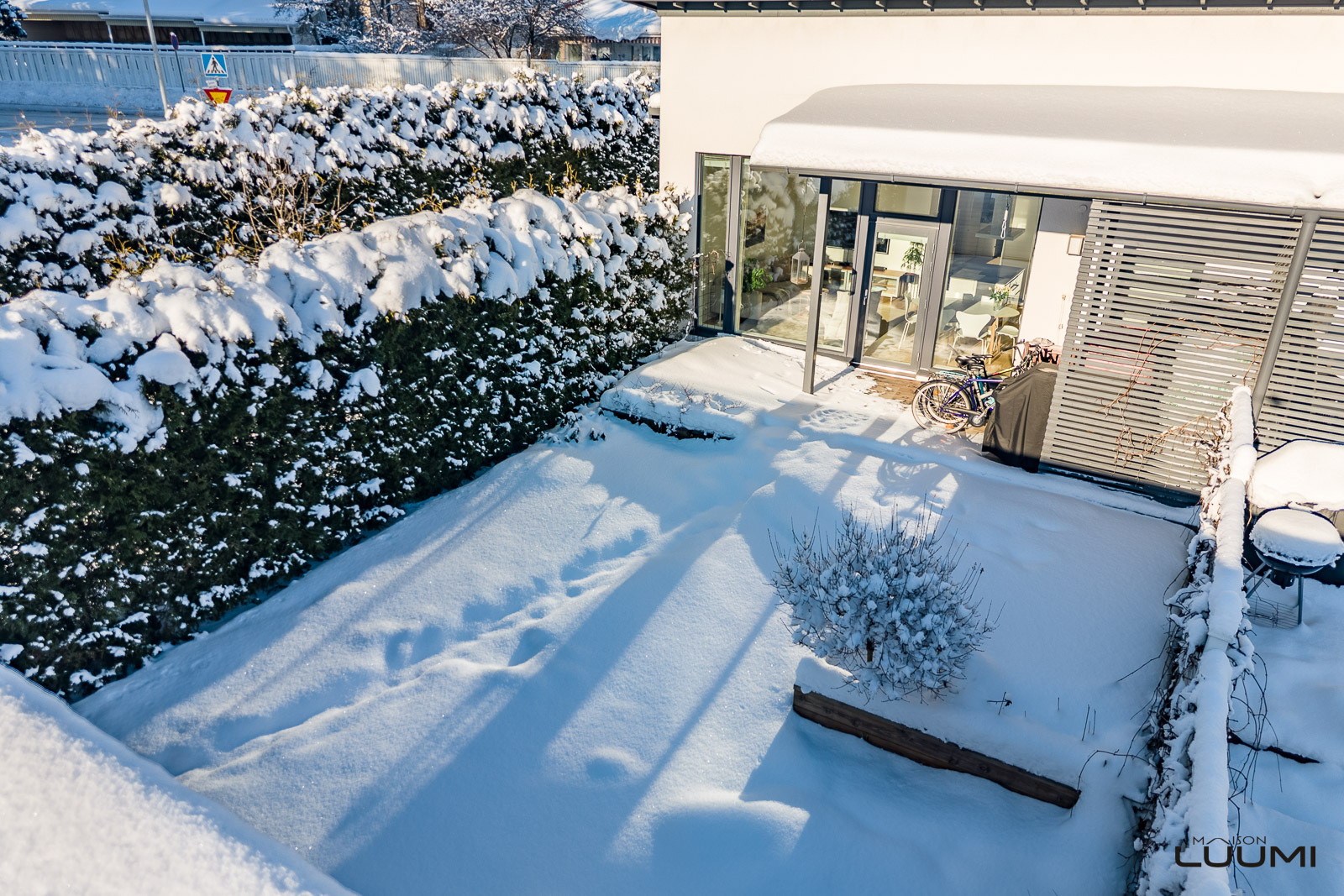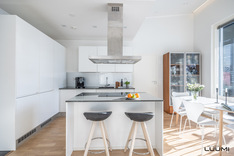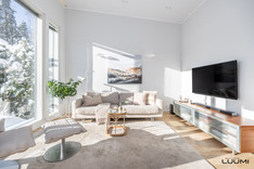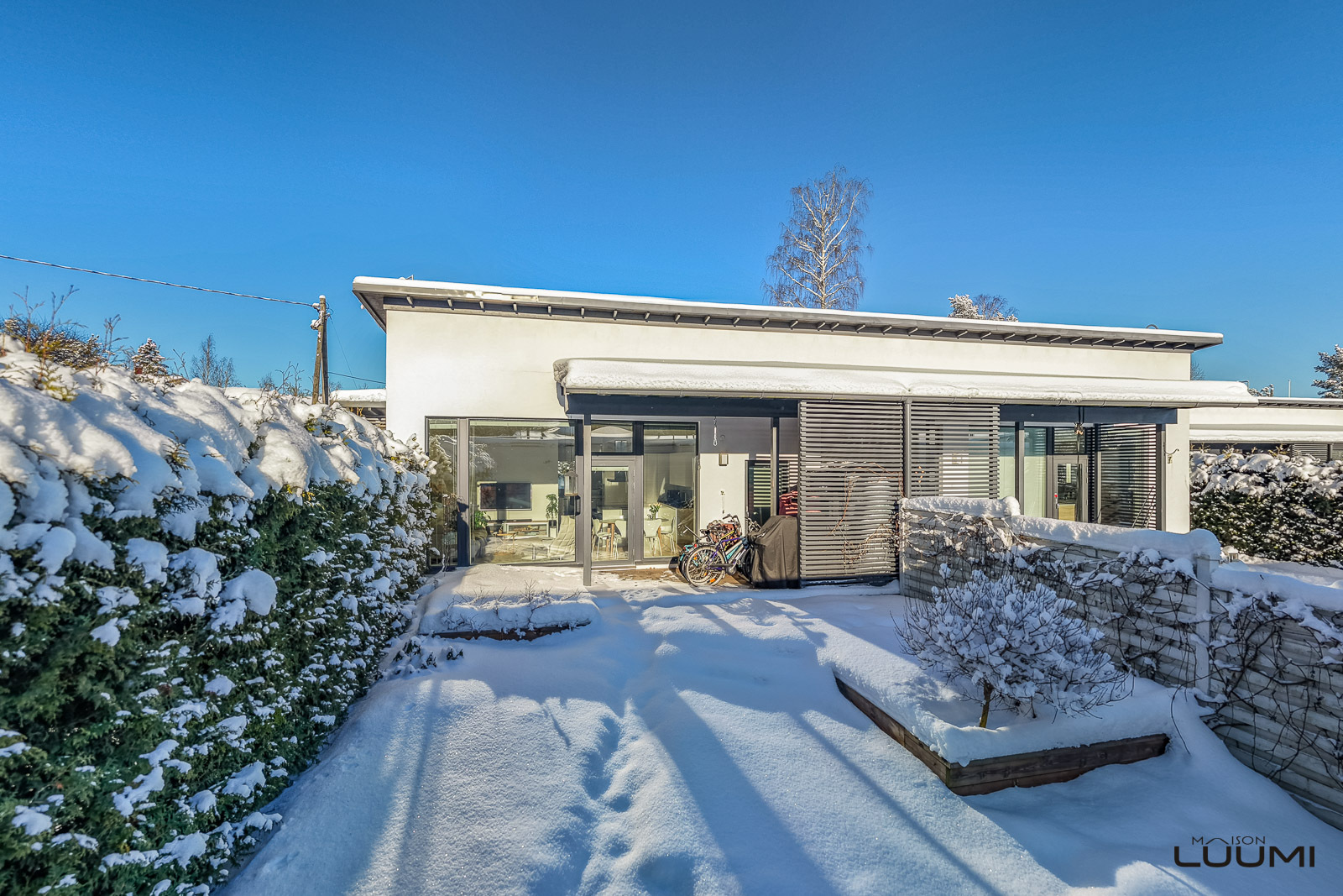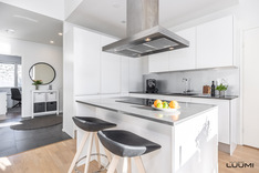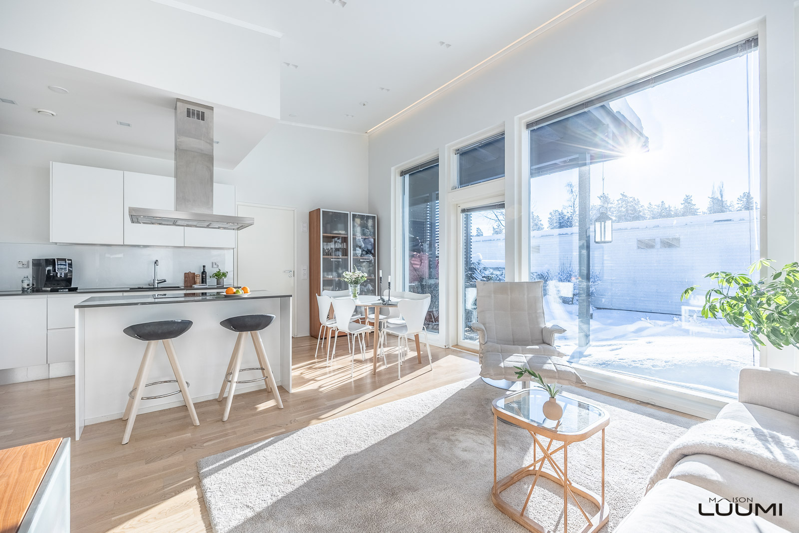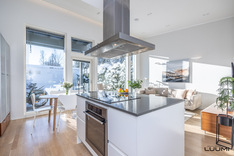 Vaalea A la Carte -avokeittiö on varustettu saarekkeella, aamiaiskaapilla ja lukuisilla kaapistoilla. Keittiö, ruokatila ja olohuone ovat korkeaa ja modernia yhtenäistä tilaa. Aurinkoinen terassi ja suojaisa piha-alue palvelevat myös yhdessäoloa perheen ja ystävien kesken.