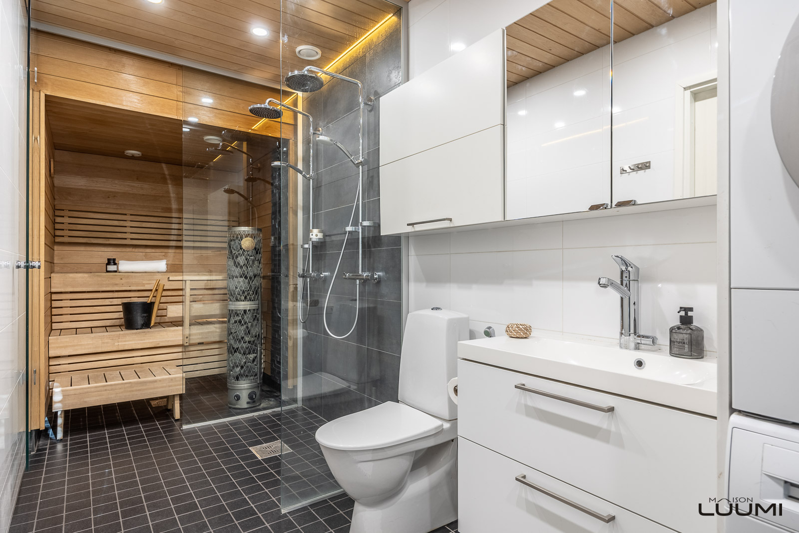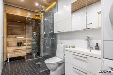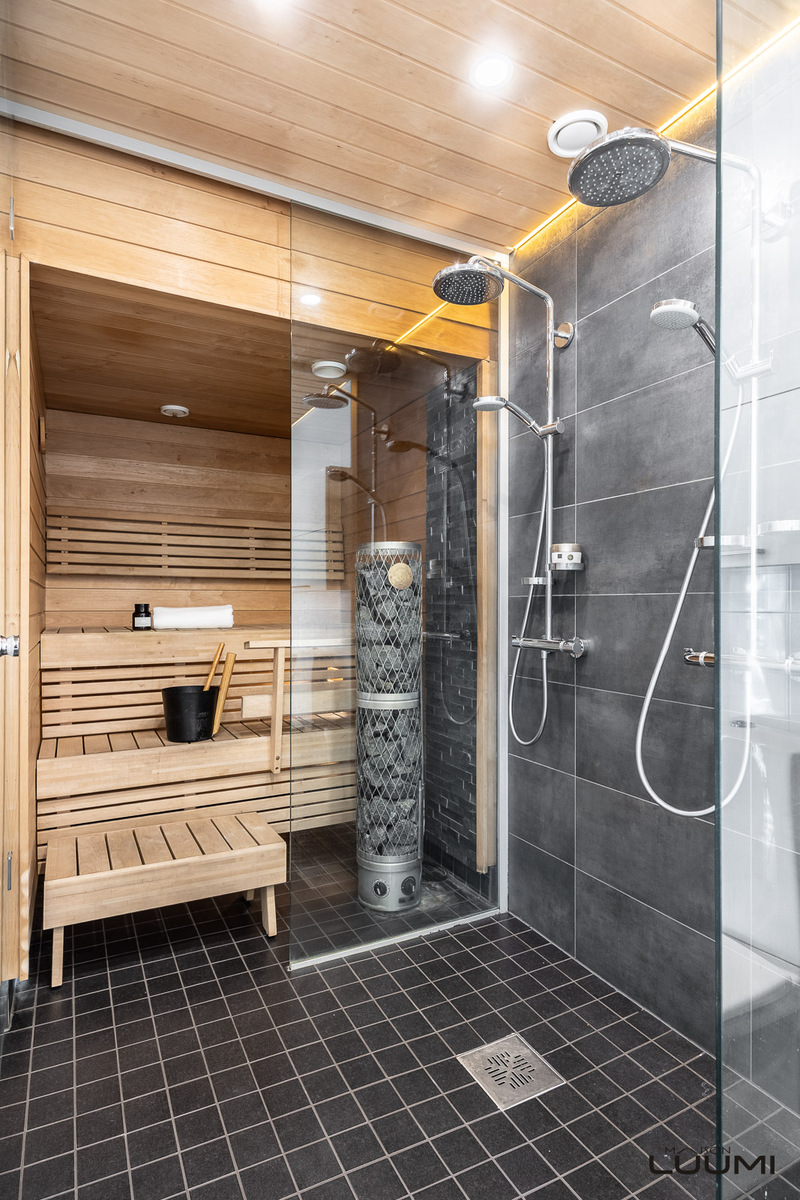 Alkuperäiset omistajat ovat rakennusvaiheessa tehneet uuteen kotiinsa toimivia parannuksia ja saaneet taidokkaasti suunnitelluista asuinneliöistä vielä enemmän irti. Erikoismaininnan ansaitsee upea saunaosasto, josta on suora kulku ulos vilpolaan. Pyykkihuollolle on luonnollisesti myös varattuna oma tilansa.